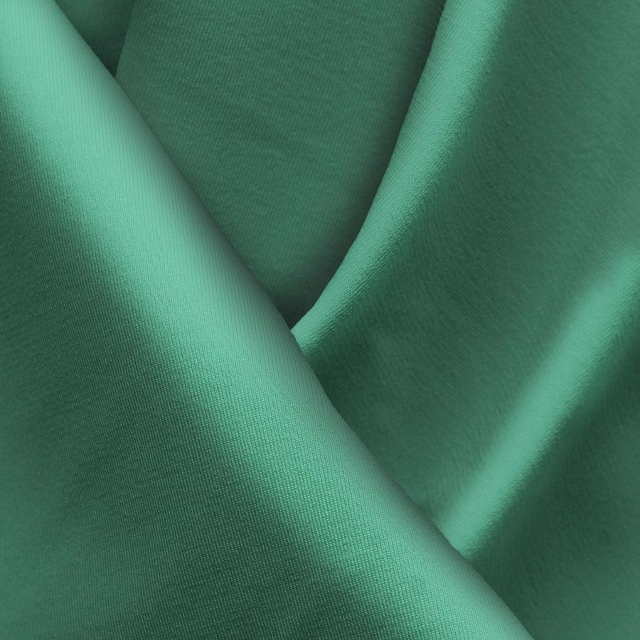 La tela base es Lycra Reciclada - Seal de 230 gr/m2, una lycra compuesta por un 75% de poliéster y un 25% de elastano de 230 gr/m2 de gramaje con un ancho de 150 cm. El color liso impreso es verde Hooker, con un CMYK de 77 31 64 18, que se caracteriza por un tono verde intenso y profundo. Este color combina especialmente bien con tonos rojos y dorados, y con colores fríos, como el azul oscuro y el gris.