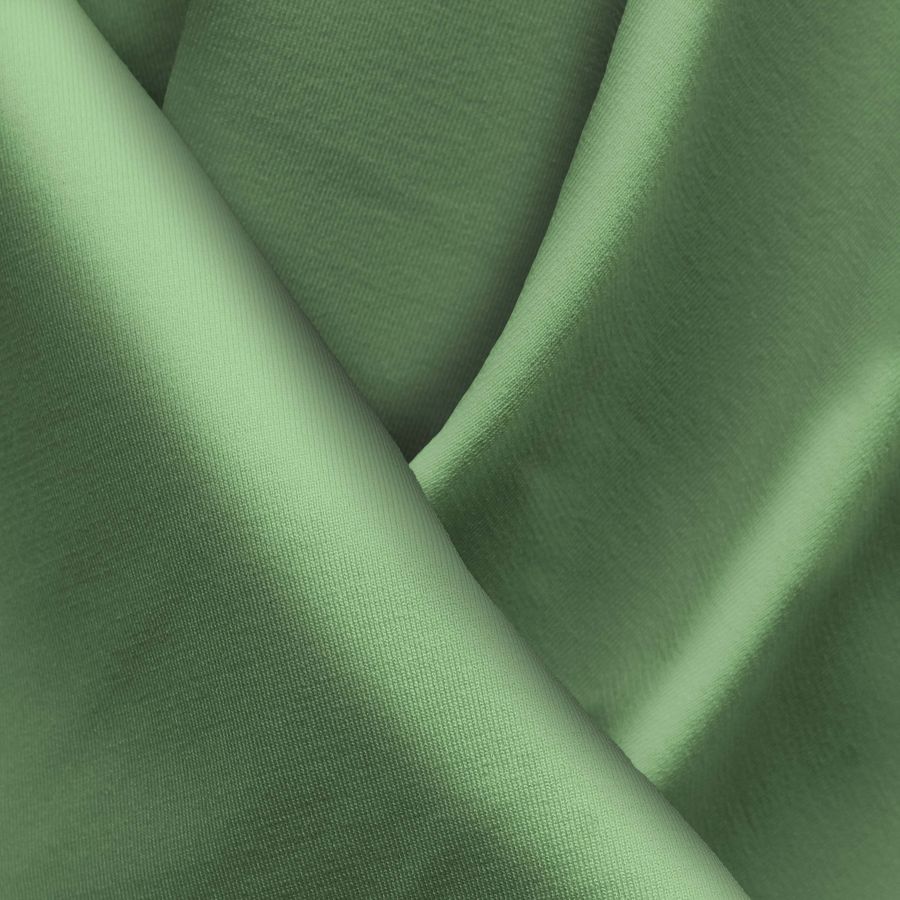 La tela base es Lycra Reciclada - Seal de 230 gr/m2, con una composición del 75% de poliéster y un 25% de elastano. El color liso impreso es un verde marchito, con una combinación de tinta CYMK 65-31-72-14. Este color secundario es una tonalidad suave y terrosa de verde, que combina bien con otros verdes más intensos, marrones y ocres.