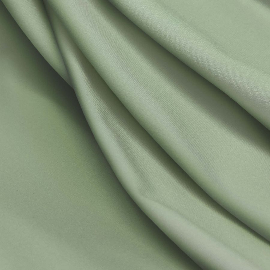 La tela base es la Lycra Reciclada - Seal de 230 gr/m2, una tela elástica y resistente compuesta por 75% Polyéster y 25% Elastano. El color liso impreso es un Verde pastel con un CMYK de 28 0 40 0, lo que lo hace un color suave, sobrio y elegante. Este color se combina perfectamente con tonos más fuertes, como por ejemplo el rojo, el rosa, el naranja y el amarillo, lo que permite crear una amplia gama de diseños y estampados.
