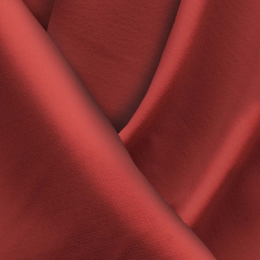La tela base es la Lycra Reciclada - Seal de 230 gr/m2, compuesta por un 75% de poliéster y un 25% de elastano, con un gramaje de 230 gr/m2 y un ancho de 150cm. El color liso impreso es un rojo auburn, con un CMYK de 27 93 84 29. Este color es una mezcla de rojo intenso con un toque granate, lo que produce un efecto de tono terroso y sofisticado. Combina especialmente bien con tonos tierra, ocres y naranjas oscuros.
