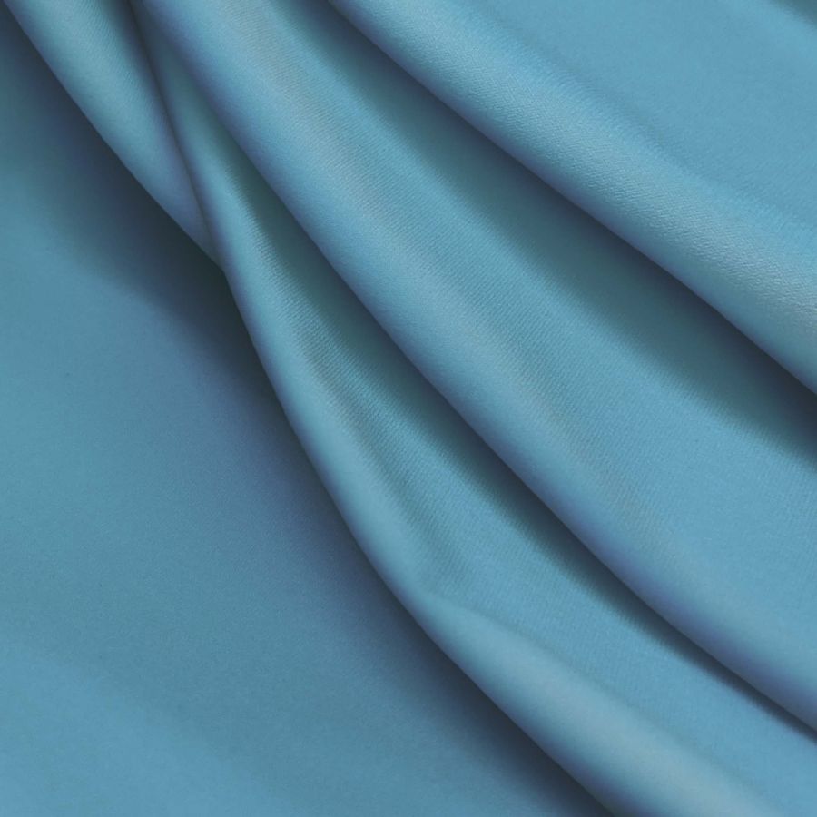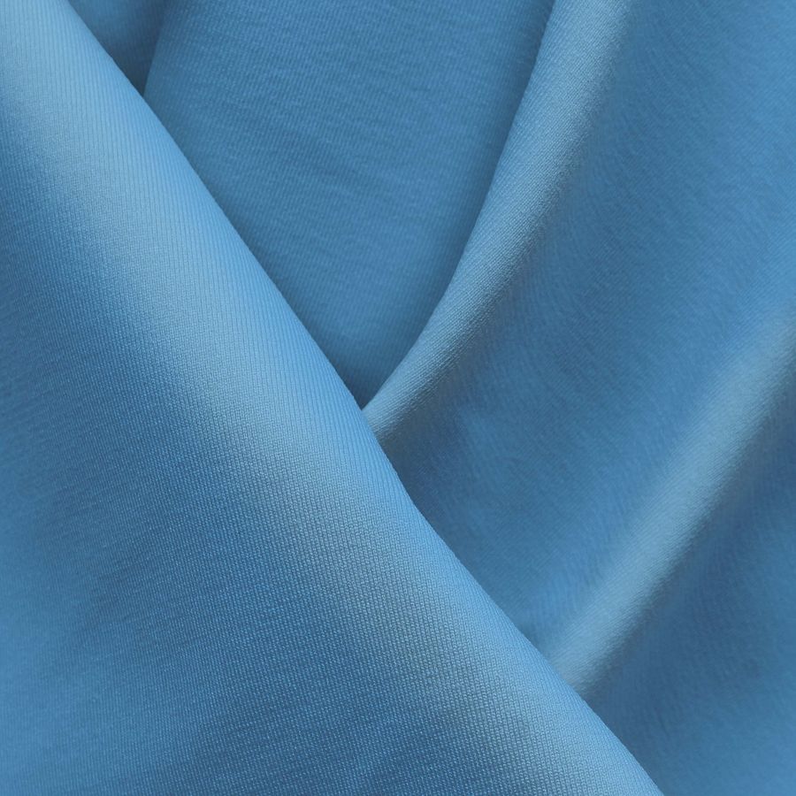 La tela base es Lycra Reciclada - Seal de 230 gr/m2, siendo un tipo de lycra compuesta por un 75% de poliéster y un 25% de elastano, con un gramaje de 230 gr/m2 y una anchura de 150 cm. El color liso impreso es Azul Frita, cuyo CMYK es 53 11 0 0, compuesto por tintas Cyan, Magenta, Yellow y Black. Este tono de azul es muy vivo y se asocia con la creatividad, la confianza y la tranquilidad. Además, el color secundario Frita, que se incorpora en menor medida, aporta una pizca de calidez a la paleta de color, haciéndola más equilibrada. Combina perfectamente con colores fríos como el blanco o el gris, y también con los cálidos, como los tonos tostados o el color mostaza.