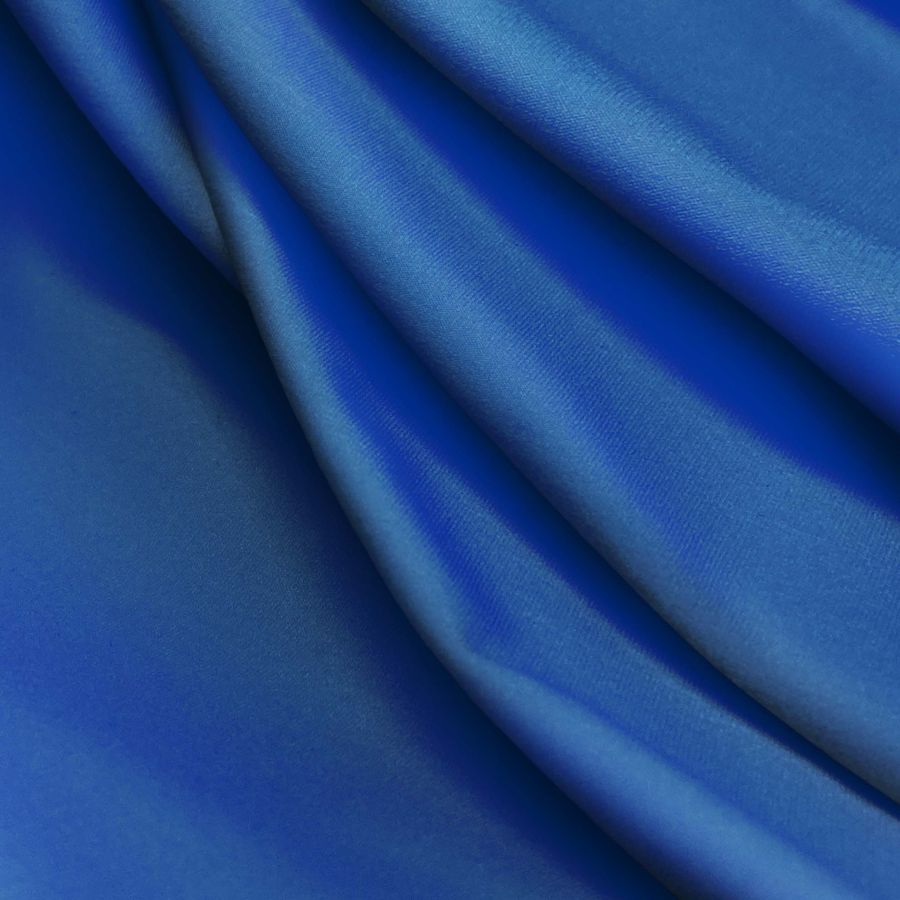 La tela base es la Lycra Reciclada - Seal de 230 gr/m2, compuesta de 75% poliéster y 25% elastano, con una gramaje de 230 gr/m2 y un ancho de 150 cm. El color liso impreso en la tela es de un azul oscuro, con los siguientes valores de tinta CMYK: 100 82 32 15. La combinación de los tonos de cian, magenta, amarillo y negro permite obtener un tono azul de gran intensidad, que simboliza la profundidad y la estabilidad. El azul oscuro combina perfectamente con tonos claros, como el blanco y el gris, y con tonos brillantes, como el dorado y el plateado.