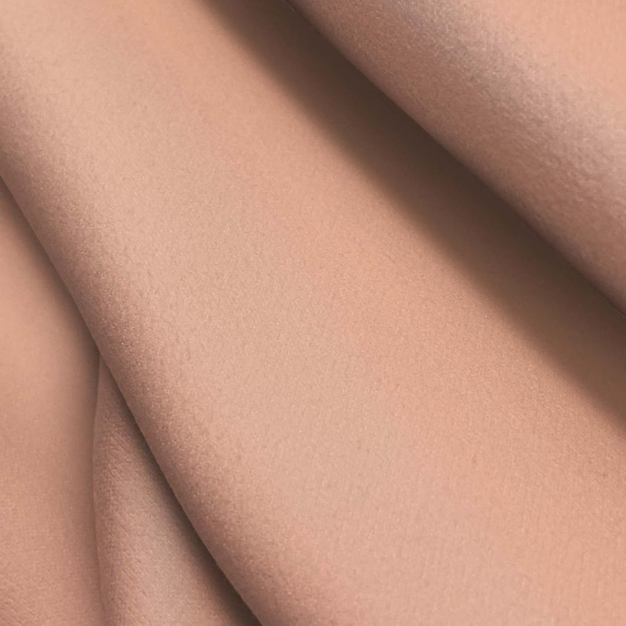 La tela base es la Microfibra para Toalla - Swing, con una composición de 100% poliéster, un gramaje de 200 gr/m2 y un ancho de 160 cm. En cuanto al color liso impreso, es de tonalidad Rojo-Salmón, siendo el CMYK 0 38 37 0. Este color secundario transmite una sensación de calidez y vitalidad, combinando bien con tonos tierra, verdes y azules.