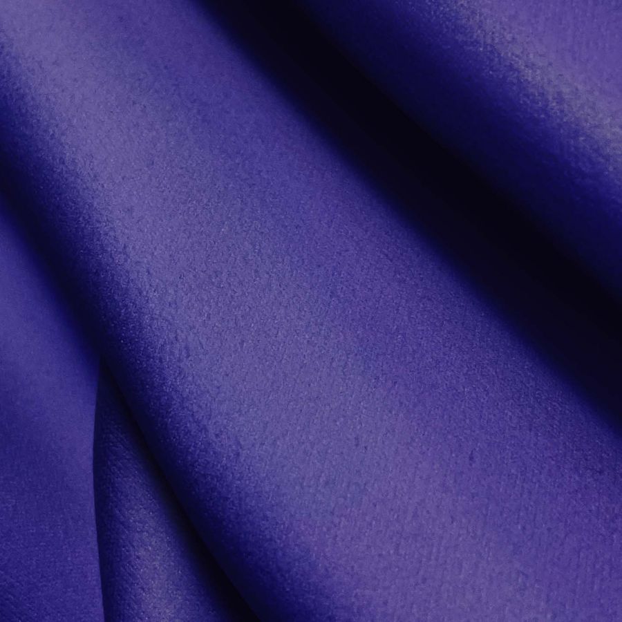 La tela base del tejido es una microfibra para toalla tipo Swing, con una composición del 100% poliéster y un gramaje de 200 gr/m2. El color liso impreso es un vibrante morado con matices de azul purpureo, con un CMYK de 97, 97, 5, 1. Este color secundario es símbolo de la creatividad y la energía, siendo perfectamente combinable con tonos cálidos como el amarillo o tonos fríos como el azul. Es importante destacar que la tela está impresa con el color liso a una sola cara por impresión digital textil, lo que significa que la imagen se funde con el tejido sin sobresalir ni perder forma con los lavados. Las características de la tela base son suavidad y una textura lisa, lo que la hace perfecta para usos como toallas, paños de cocina o albornoces deportivos. Además, su tejido de microfibra la hacen ligera y perfecta para el verano. En cuanto a los cuidados, no se recomienda blanquear, se debe lavar a temperatura máxima de 30°C, no se puede lavar en seco, ni planchar, ni secar en secadora. La tecnología de impresión utilizada en la creación de este tejido es la sublimación (poliéster), lo que permite una sujeción más que adecuada del pigmento al tejido.