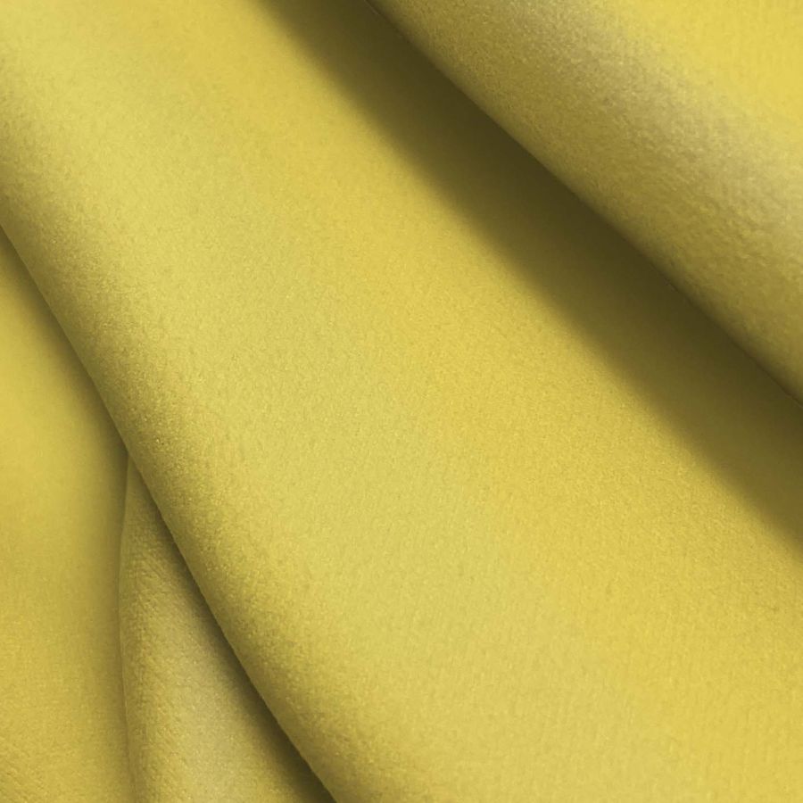 La tela base de este tejido es la Microfibra para Toalla - Swing, un tejido suave y liso compuesto en su totalidad por poliéster con un gramaje de 200 gr/m2 y un ancho de 160 cm. El color liso impreso en la tela es un vibrante amarillo de China con un CMYK de 4 12 72 0, lo que indica que la tinta cian aporta un toque de verde lima al color final. Este color es ideal para combinar con tonos azules, verdes y grises claros.
