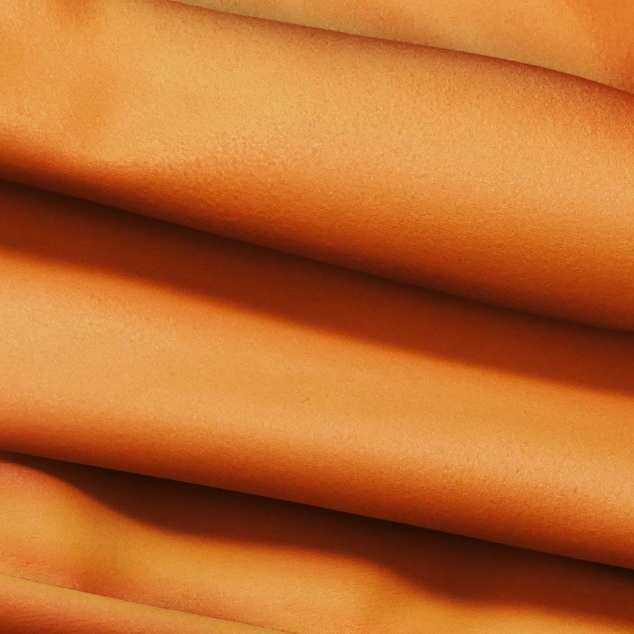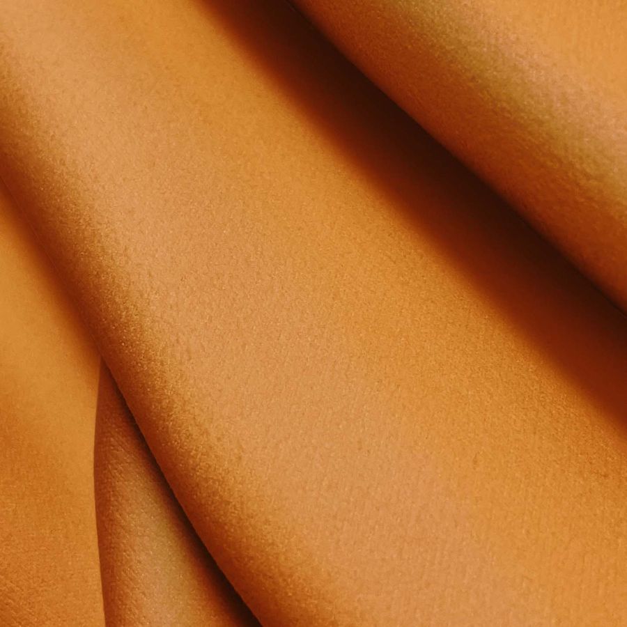 La tela base de este material es una microfibra para toalla llamada Swing, compuesta por un 100% de poliéster y con un gramaje de 200 gr/m2. Tiene un ancho de tela de 160 cm y se presenta en un color liso impreso de naranja gamba, revelado a través del CMYK con 2 de cian, 61 de magenta, 91 de amarillo y 0 de negro. Este color secundario presenta una tonalidad energética y vibrante, que combina perfectamente con colores neutros como blanco, beige y gris, además de con otros tonos cálidos como el marrón y el amarillo.
