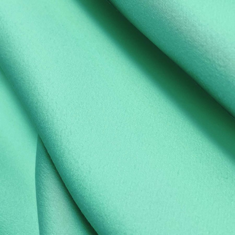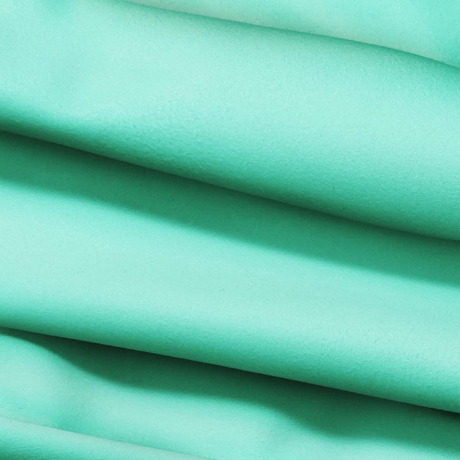 Esta tela base es la Microfibra para Toalla - Swing, de composición 100% poliéster y gramaje de 200 gr/m2. El color liso impreso es un verde aguamarina, cuyo CMYK es 46 0 32 0 y se combina armoniosamente con tonalidades azules y blancos. El tejido está impreso con el color liso a una sola cara por impresión digital textil. La tela base tiene una textura suave y lisa al tacto y es apta para usos textiles de hogar, baño (toallas y albornoces) y también para uso deportivo.