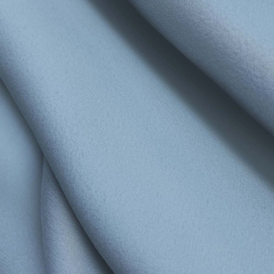 La tela base de esta prenda es la Microfibra para Toalla - Swing. Su composición es 100% poliéster con un gramaje de 200 gr/m2 y un ancho de 160 cm. El color liso impreso es un precioso tono de azul, con una tinta Cyan de 46, Magenta de 22, Yellow de 10 y Black de 0, lo que da un CMYK de 46 22 10 0. Este azul se caracteriza por ser un tono luminoso y sereno, dando una sensación de frescura y tranquilidad. Este color secundario combina especialmente con el blanco, gris, rosa y verde claro.