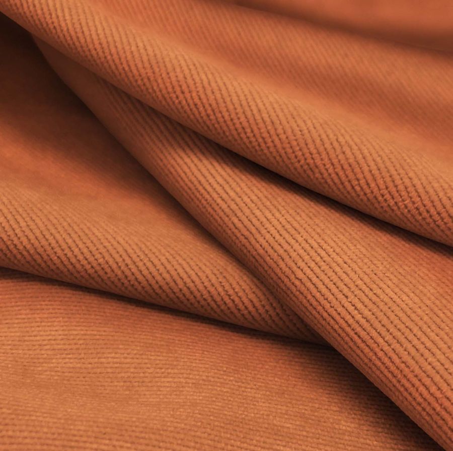 La tela base es una Pana Aterciopelada Dublin, compuesta en un 85% POLIÉSTER, 12% POLIAMIDA y 3% ELASTANO con un gramaje de 280 gr/m2 y ancho de 150 cm. El color liso es un Rojo Bermellón medio impreso con tecnología de sublimación (POLIÉSTER). Los atributos del color impreso son 18% de Tinta Cyan, 70% de Tinta Magenta, 79% de Tinta Yellow y 6% de Tinta Black, con una proyección visual de brillantez y suavidad, gracias a la textura de la tela. El rojo bermellón medio es un color apasionado, valiente y enérgico, que combina perfecto con otros colores cálidos como el amarillo y el naranja.