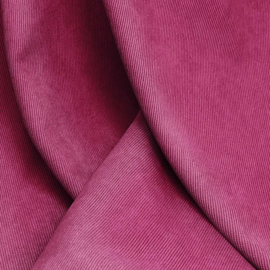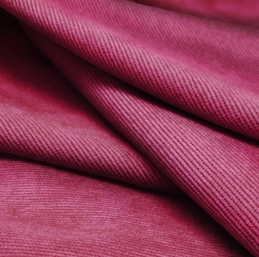 La tela base es una Pana Aterciopelada - Dublin, con una composición de 85% POLIÉSTER, 12% POLIAMIDA y 3% ELASTANO. El color liso impreso es rojo carmín, con un CMYK de 28 91 36 23. Es una tela suave y brillante al tacto y a la vista. El color rojo carmín simboliza el amor, la pasión y el deseo, pero también puede representar la agresividad y el peligro. Combina perfectamente con colores neutros como el gris, blanco y negro, pero también con amarillos y azules claros.