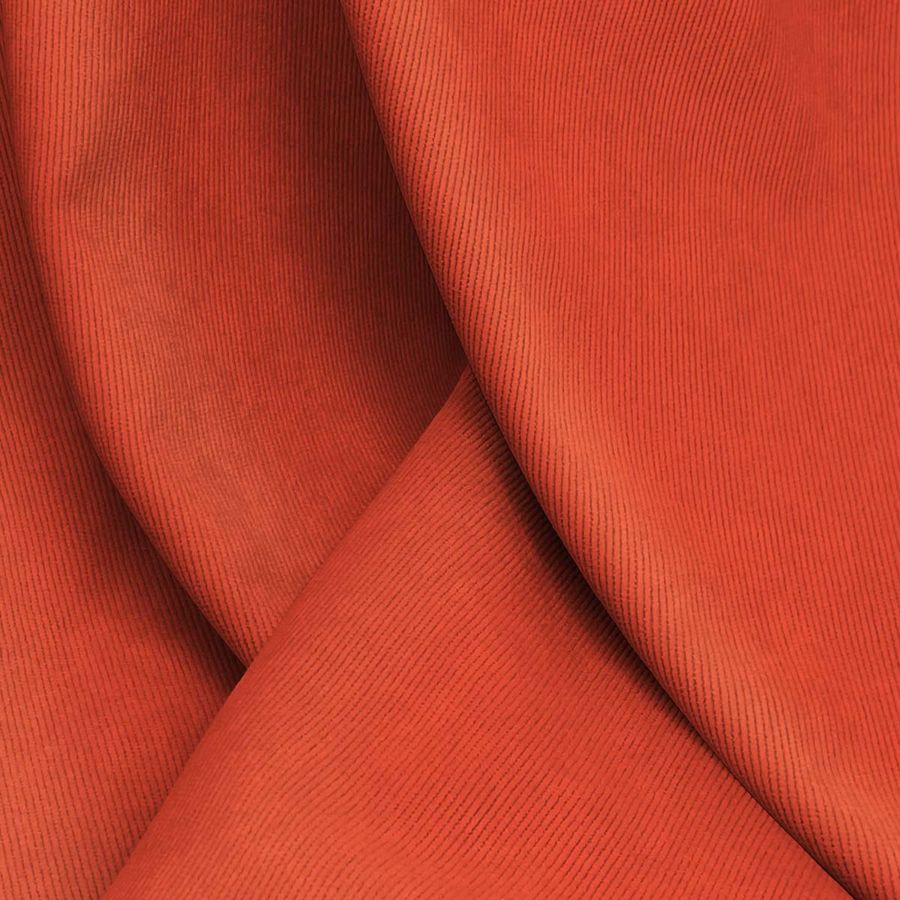 La tela base es la Pana Aterciopelada - Dublin, de composición 85% poliéster, 12% poliamida y 3% elastano. El color liso impreso es de tonalidad Rojo Cinabrio, con un CMYK de 11 86 87 2. Este color se caracteriza por su luminosidad y profundidad a la vez que añade calidez y energía a los espacios donde se aplica. Combina perfectamente con otros tonos como el gris, el beige y el blanco, creando una atmósfera acogedora.