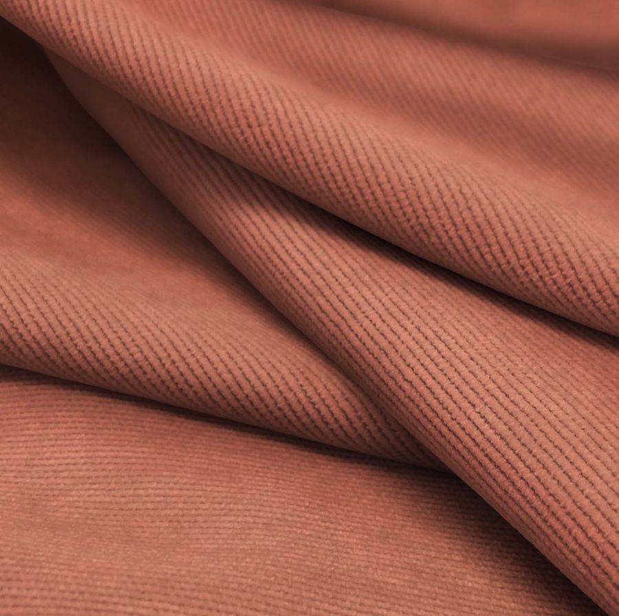 Las características de la tela base son suavidad y brillo visual, gracias a su textura de pana aterciopelada que resalta el color Rojo Cobre. Esta tela es adecuada para usos en decoración y tapicería, tanto de sillas como de sofás, siendo perfecta para aquellos espacios que buscan crear un ambiente acogedor y sofisticado. También es una tela versátil que se puede utilizar en moda, como sobrecamisa o chaqueta, o en accesorios como bolsos o mochilas.