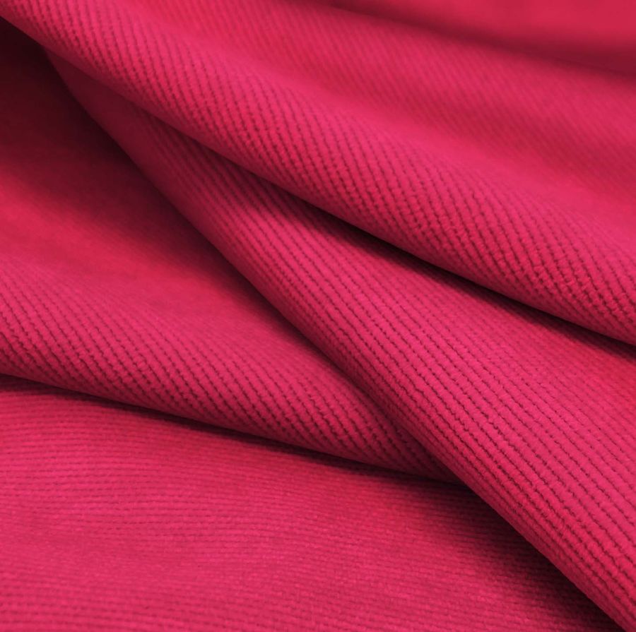 La tela base de este tejido es la Pana Aterciopelada - Dublin, una tela de pana compuesta por 85% poliéster, 12% poliamida y 3% elastano, con un gramaje de 280 gr/m2 y un ancho de 150 cm. Su color liso impreso es un Rojo Crayola, de acuerdo al CMYK 4 94 55 0. Este color se caracteriza por ser intenso y llamativo, con una mezcla de tonos rojos y naranjas que lo hace muy versátil para combinarse con otros colores.