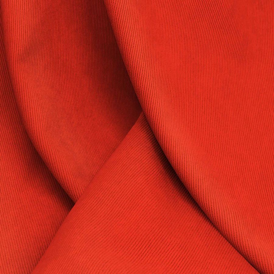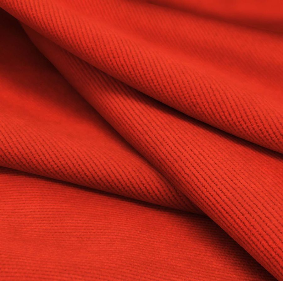 La tela base es la Pana Aterciopelada- Dublin, compuesta por 85% poliéster, 12% poliamida y 3% elastano, con un gramaje de 280 gr/m2 y una anchura de 150cm. La tela es de un vibrante color rojo ferrari, impreso a una sola cara mediante la tecnología de sublimación (POLIÉSTER), con un CMYK de 0 92 91 0, lo que resulta en un tono intenso y brillante.