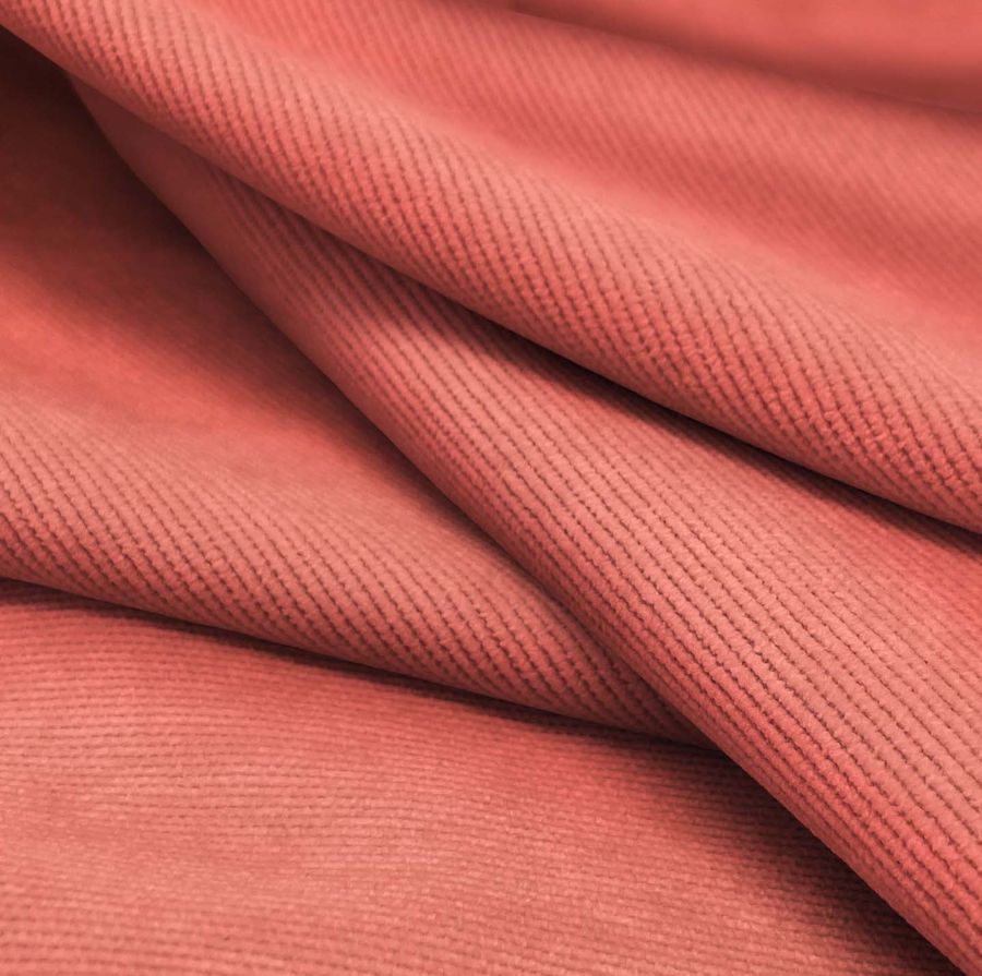 La tela base, Pana Aterciopelada - Dublin, es una pana compuesta por un 85% de poliéster, un 12% de poliamida y un 3% de elastano, con un gramaje de 280 gr/m2 y un ancho de 150 cm. El color liso impreso es un rojo claro con un CMYK de 0 71 53 0, lo que indica una alta presencia de tonos rojos y una ausencia completa de tinta negra. Este color secundario, por sus características, transmite energía y vitalidad, y combina especialmente bien con colores neutros como beige o gris.