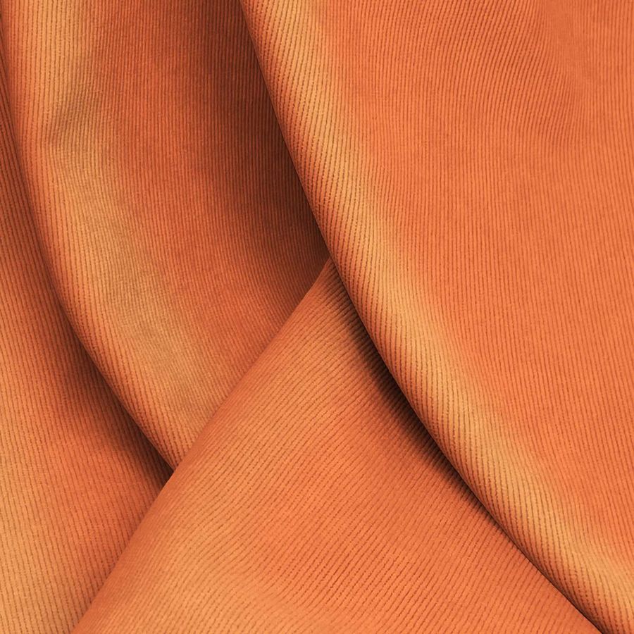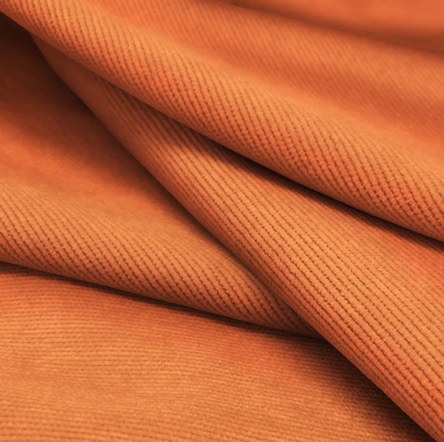 La tela base es la Pana Aterciopelada - Dublin, con un gramaje de 280 gr/m2, compuesta por 85% POLIÉSTER, 12% POLIAMIDA y 3% ELASTANO. El color liso impreso es un Rojo Arena del Desierto con un CMYK de 0 69 73 0, lo que implica una alta presencia de Magenta y Amarillo. Este color es evocador y cálido, además de combinar bien con tonos crema, beige, tierra y marrón. Es importante destacar que la tela está impresa con este color liso solo por una cara a través de impresión digital textil.