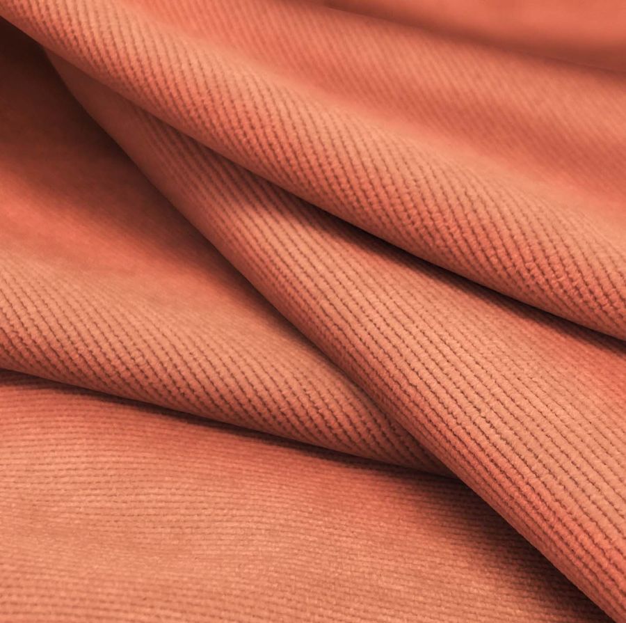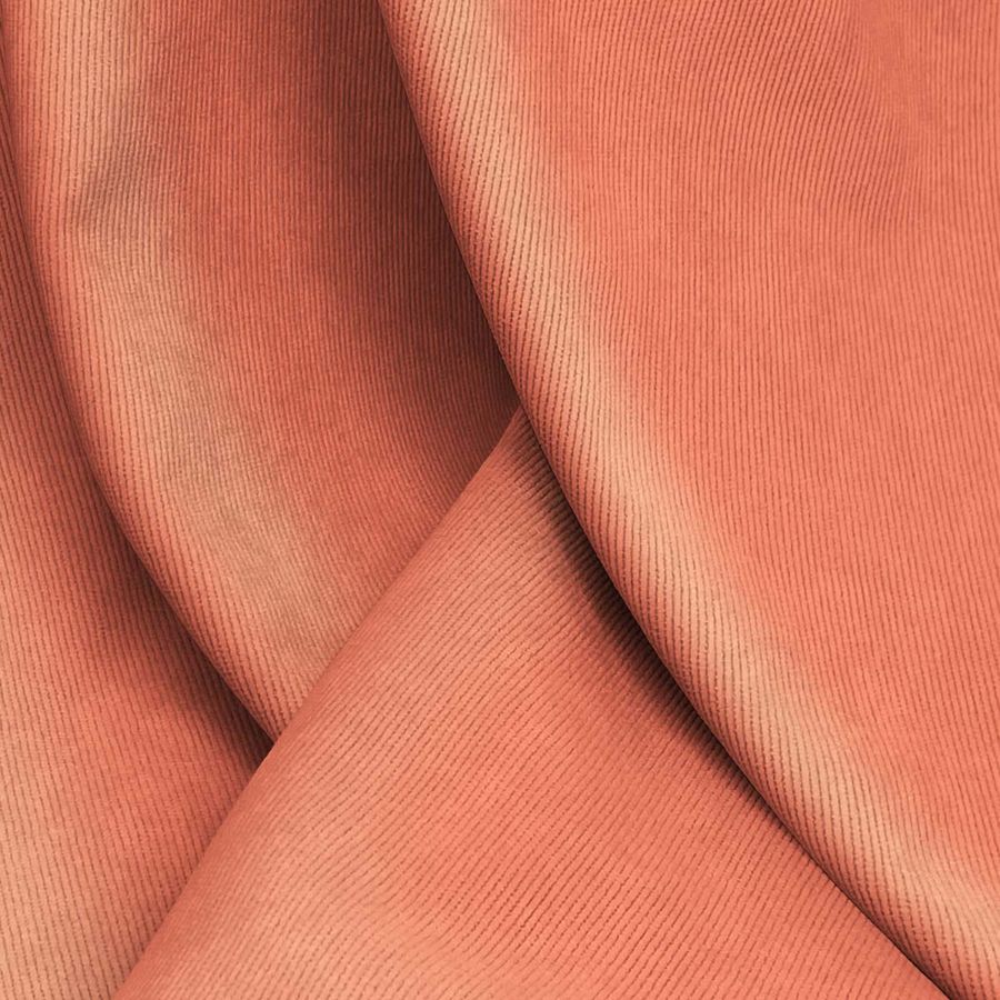 La tela base de este tejido es la Pana Aterciopelada Dublin, con una composición de 85% poliéster, 12% poliamida y 3% elastano, un gramaje de 280 gr/m2 y un ancho de 150 cm. El color liso impreso en la tela es rojo annato claro, con un CMYK de 0 67 60 0. Este color combina armoniosamente con tonos cálidos como el amarillo dorado, el borgoña y el marrón oscuro, creando un aspecto elegante y sofisticado.