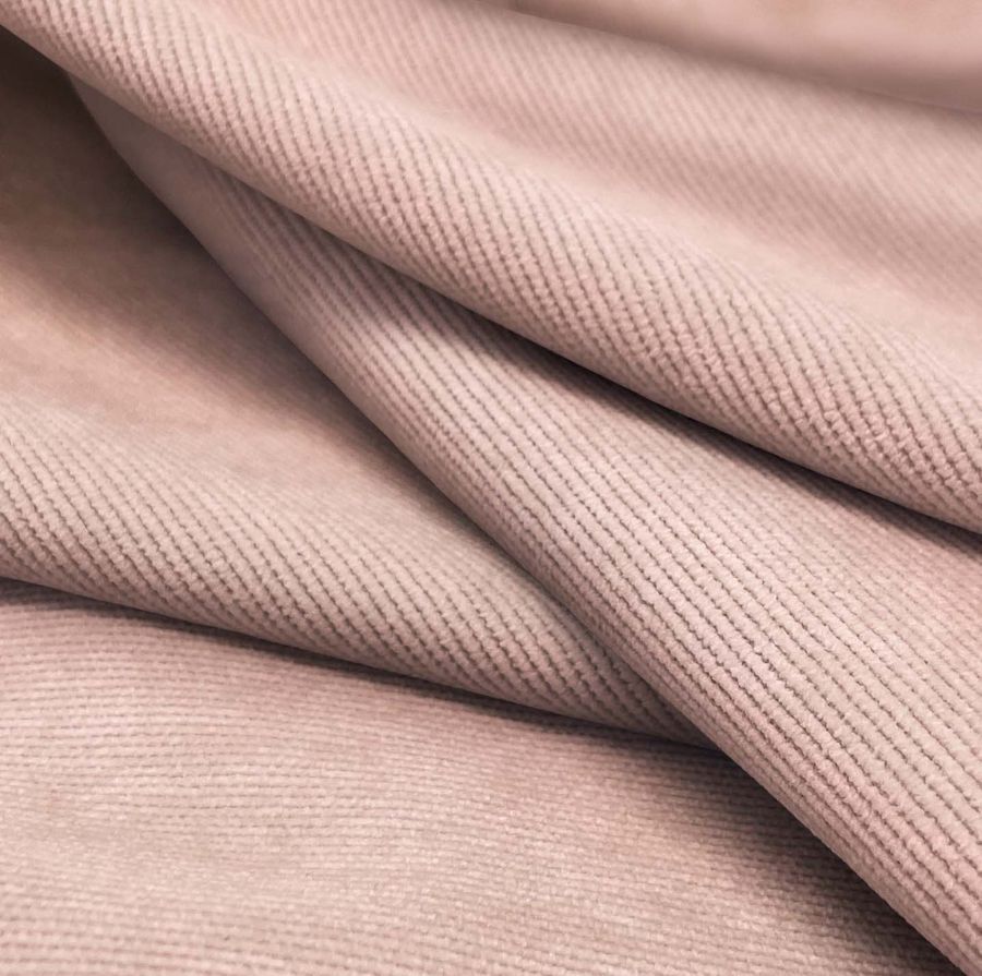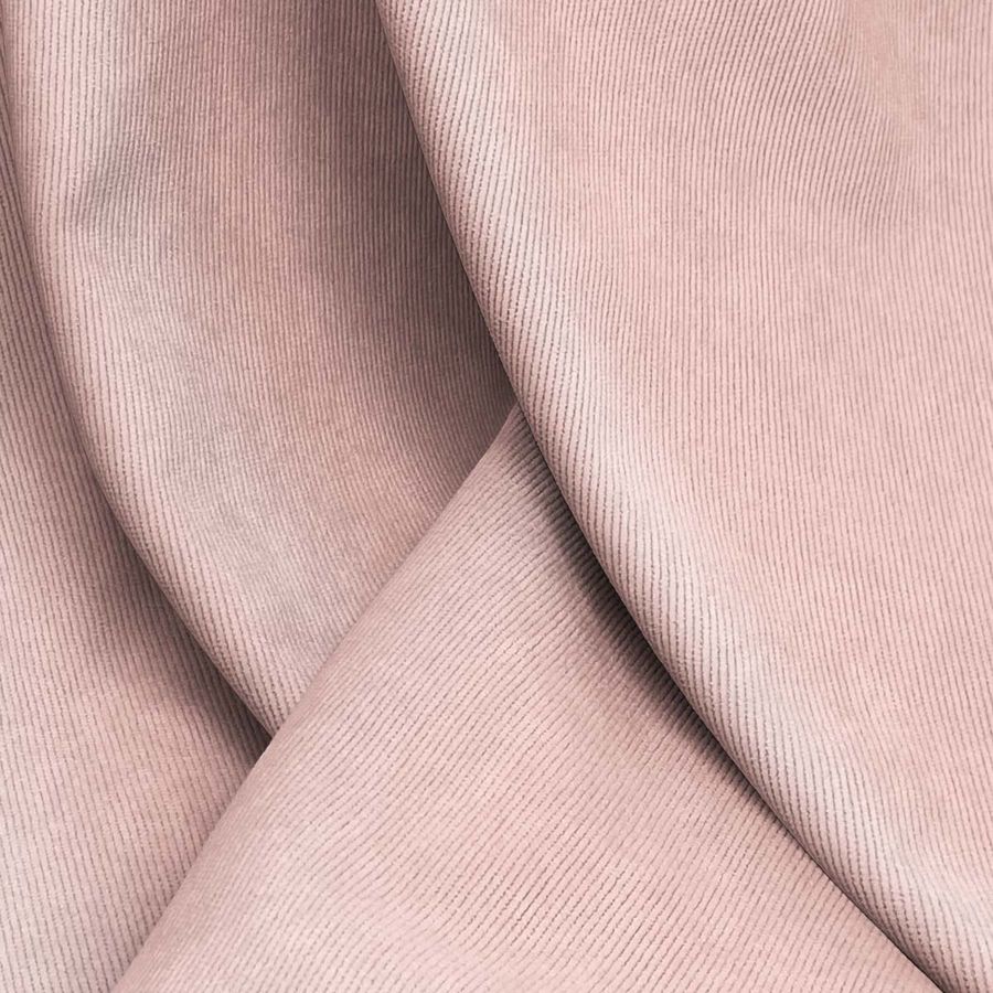 La tela base de este tejido es la Pana Aterciopelada - Dublin, compuesta por un 85% de poliéster, un 12% de poliamida y un 3% de elastano, lo que proporciona una textura suave y un brillo visual excepcional. El color liso impreso es Rojo Pálido, cuyos atributos de impresión indican que se compone de 0% de tinta de color cyan, 34% de magenta, 23% de amarillo y 0% de negro en su forma CMYK. Este tono ofrece una apariencia apagada y discreta, que combina bien con colores similares como el rosa polvoriento, el beige y el gris.