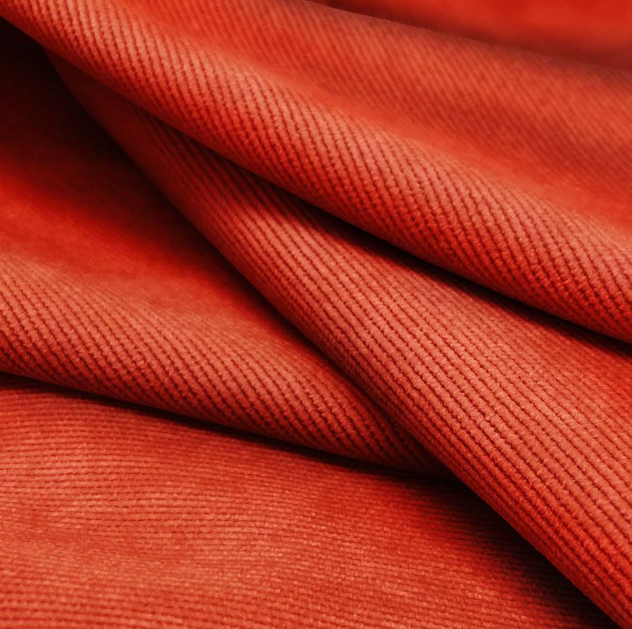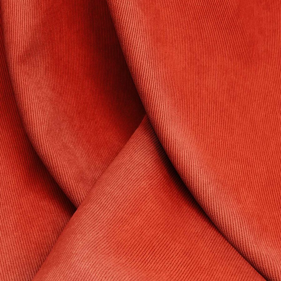 La tela base es la Pana Aterciopelada - Dublin, compuesta por 85% de poliéster, 12% de poliamida y 3% de elastano. El color liso impreso es Naranja Lava, con un CMYK de 13 94 100 3. Este color tiene una simbología de vitalidad y pasión, logrando una combinación cálida y enérgica. Es una tonalidad que se complementa bien con colores terrosos y pasteles, así como con tonos oscuros como el negro y el marrón. La tela está impresa en una sola cara por impresión digital textil, lo que le otorga una gran versatilidad en la decoración y la moda.