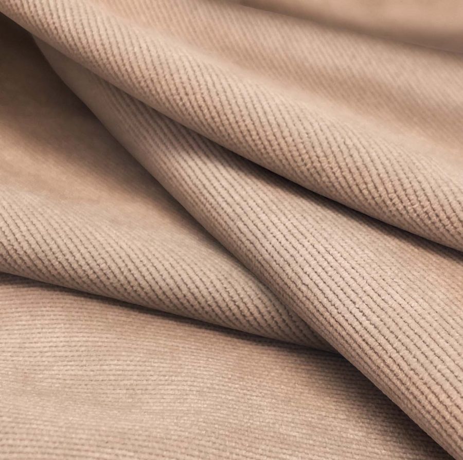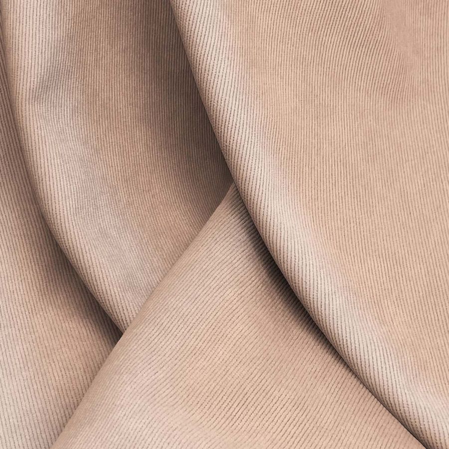 La tela base es la Pana Aterciopelada - Dublin, compuesta por un 85% de poliéster, un 12% de poliamida y un 3% de elastano, con un gramaje de 280 gr/m2 y un ancho de 150 cm. El color liso impreso es una mezcla de rosa y arena del desierto, cuyo CMYK es 12 36 40 2. Este color evoca el equilibrio emocional y la paciencia, con una sensación de suavidad y tranquilidad. Se combina especialmente bien con otros tonos terrosos como el marrón, beige y amarillo.