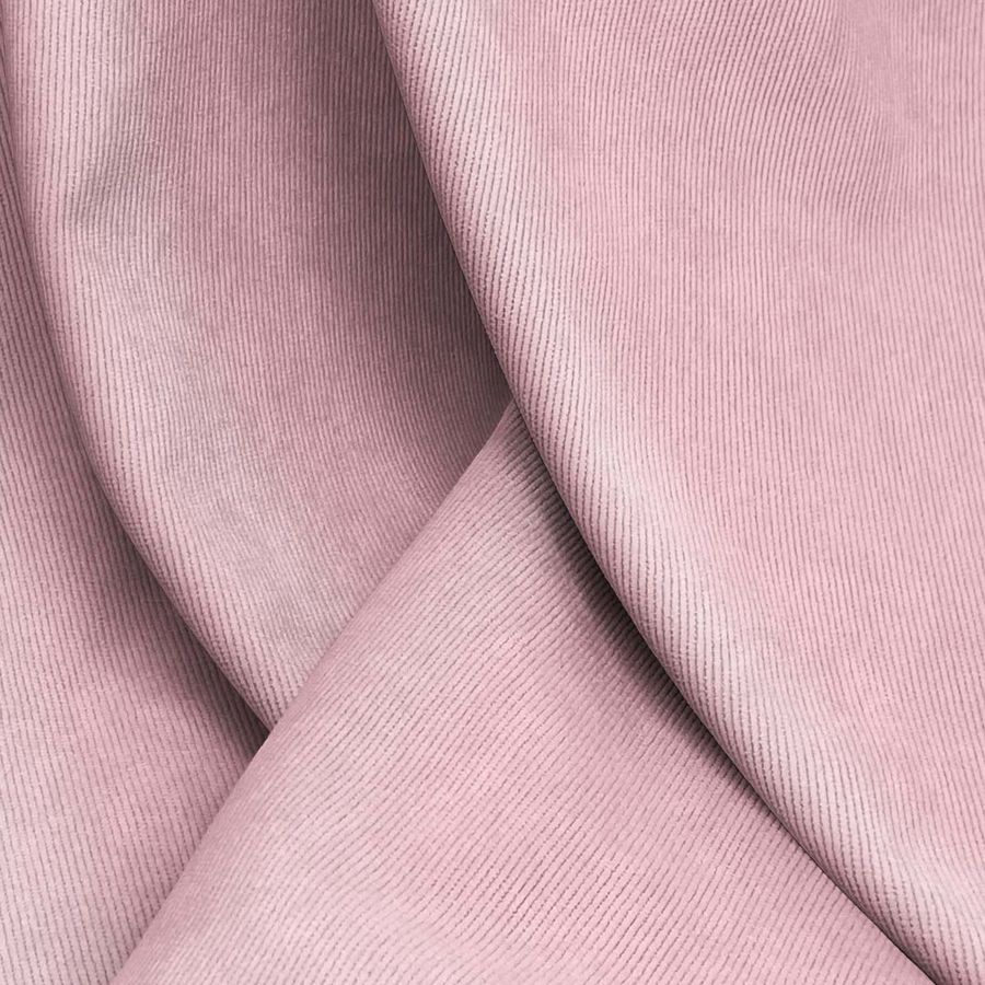 La tela base es Pana Aterciopelada - Dublin, con una composición del 85% de poliéster, 12% de poliamida y 3% de elastano. El color liso impreso es un rosa Bubblegum, con una combinación de tintas CMYK de 0 40 15 0. Este color secundario evoca sentimientos de juventud, diversión y energía. Combina bien con otros tonos pastel y neutros, como el blanco o el gris.