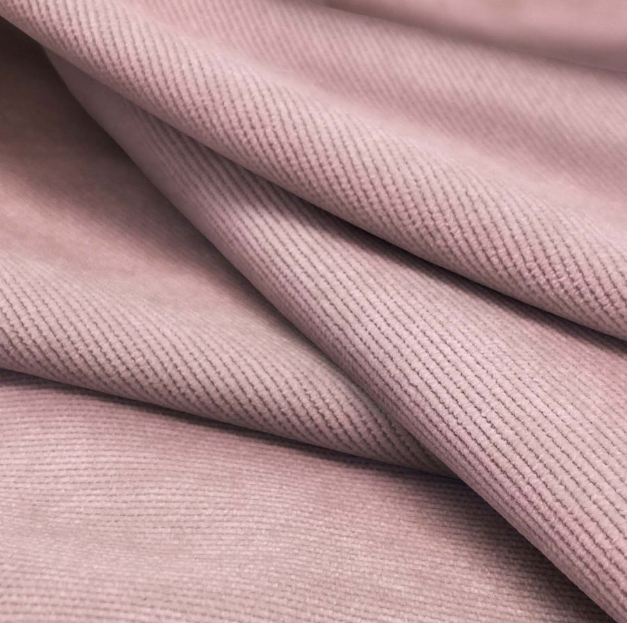 La tela base es la Pana Aterciopelada - Dublin, compuesta por 85% poliéster, 12% poliamida y 3% elastano, con un gramaje de 280 gr/m2 y un ancho de 150 cm. Su color liso impreso es rosa colorete, el cual tiene una CMYK de 11 41 21 1. Este color se identifica por su suavidad y ligereza, aportando un toque de dulzura y delicadeza en cualquier espacio, combina especialmente bien con tonos blancos, grises y tonos pastel. La tela está impresa con el color liso a una sola cara por impresión digital textil.