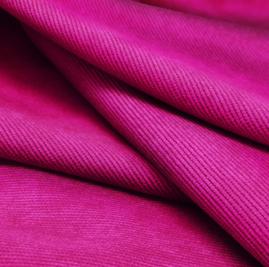La tela base de este tejido es una Pana Aterciopelada llamada Dublin, compuesta por 85% de poliéster, 12% de poliamida y 3% de elastano, con un gramaje de 280 gr/m2 y un ancho de 150 cm. El color liso impreso en rosa y orceína posee un CMYK de 22, 100, 12 y 3 respectivamente. Este color secundario es una mezcla con tonalidades de rosa y púrpura, creando un efecto único y elegante. Además, combina perfectamente con tonos neutros como el blanco o el gris.