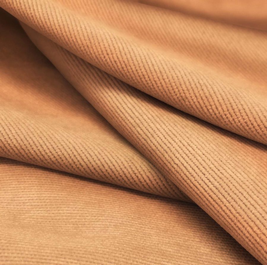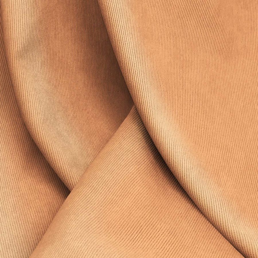 La tela base de la Pana Aterciopelada - Dublin es una pana compuesta por un 85% de poliéster, un 12% de poliamida y un 3% de elastano. Con un gramaje de 280 gr/m2 y un ancho de 150 cm, destaca por su suavidad y brillo visual. El color liso impreso en la tela tiene un tono de rosa-naranja con una combinación de cian, magenta, amarillo y negro en un CMYK de 0 51 60 0. Este color secundario es perfecto para estilos retro y bohemios, y combina especialmente bien con tonos marrones, verdes y beige.