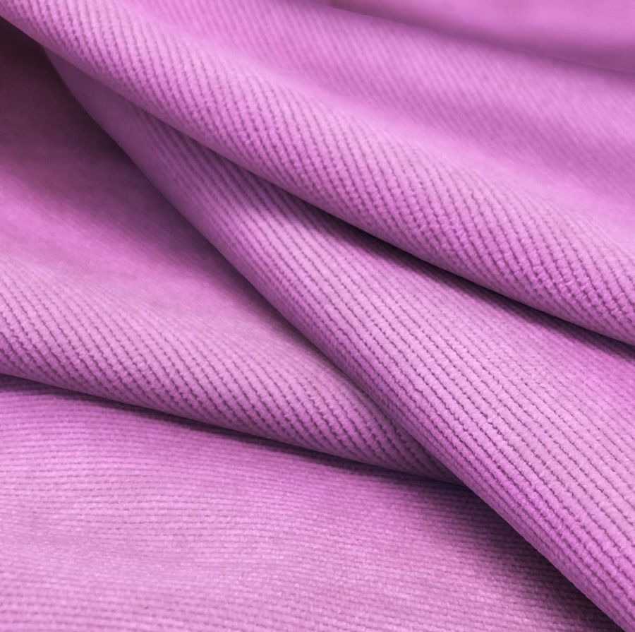 La tela base de este tejido es Pana Aterciopelada - Dublin, compuesta por 85% poliéster, 12% poliamida y 3% elastano, con un gramaje 280 gr/m2 y un ancho de 150 cm. El color liso impreso es una combinación de rosa y claro fucsia, con una tinta cyan de 20, magenta de 55, yellow de 0 y black de 0, reflejando un CMYK de 20 55 0 0, lo que le da un toque brillante y suave visualmente.