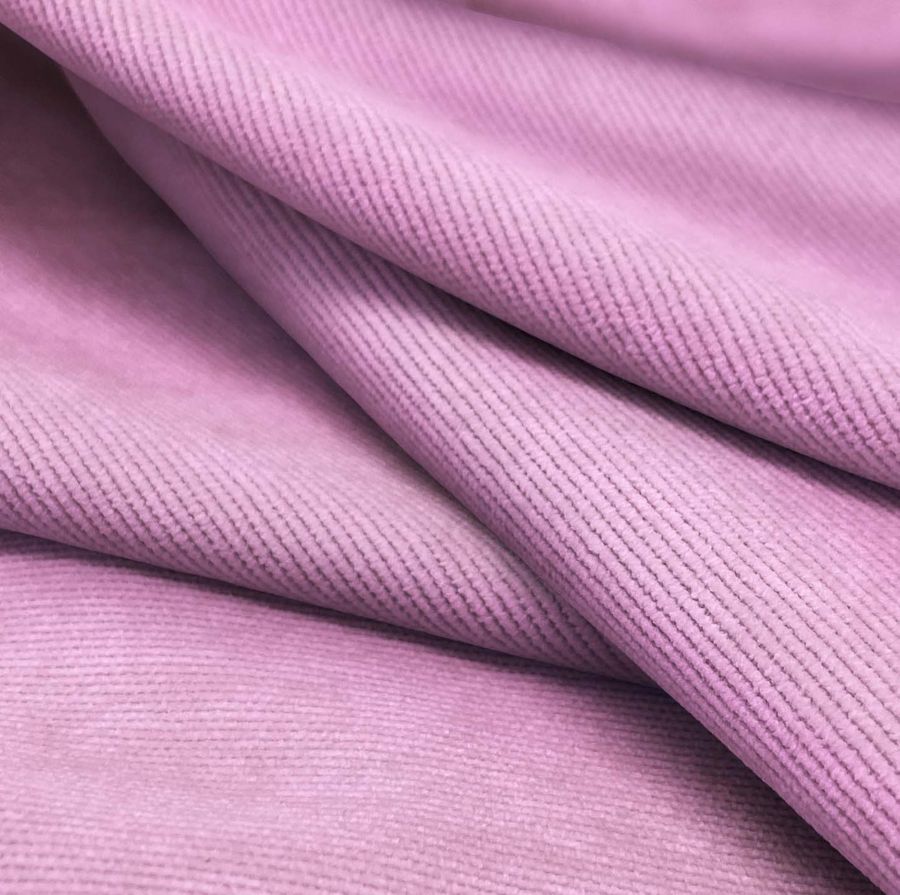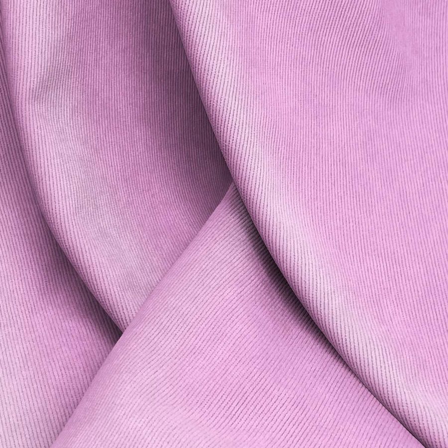 La tela base de este tejido es la Pana Aterciopelada Dublin, compuesta por un 85% de poliéster, un 12% de poliamida y un 3% de elastano, con un gramaje de 280 gr/m2 y ancho de 150 cm. El color liso impreso en la tela es una tonalidad de rosa lavanda que se obtiene a partir de una combinación de 9% de tinta cyan y 47% de tinta magenta, sin utilizar tinta yellow ni tinta black, dando como resultado un CMYK de 9 47 0 0. Este color es suave, con una textura brillante y visual que le da un toque de elegancia y sofisticación. El color se combina muy bien con tonos suaves de gris, marrón y beige.