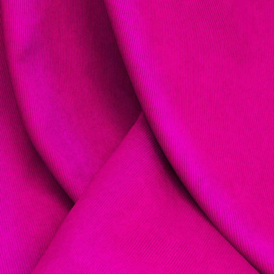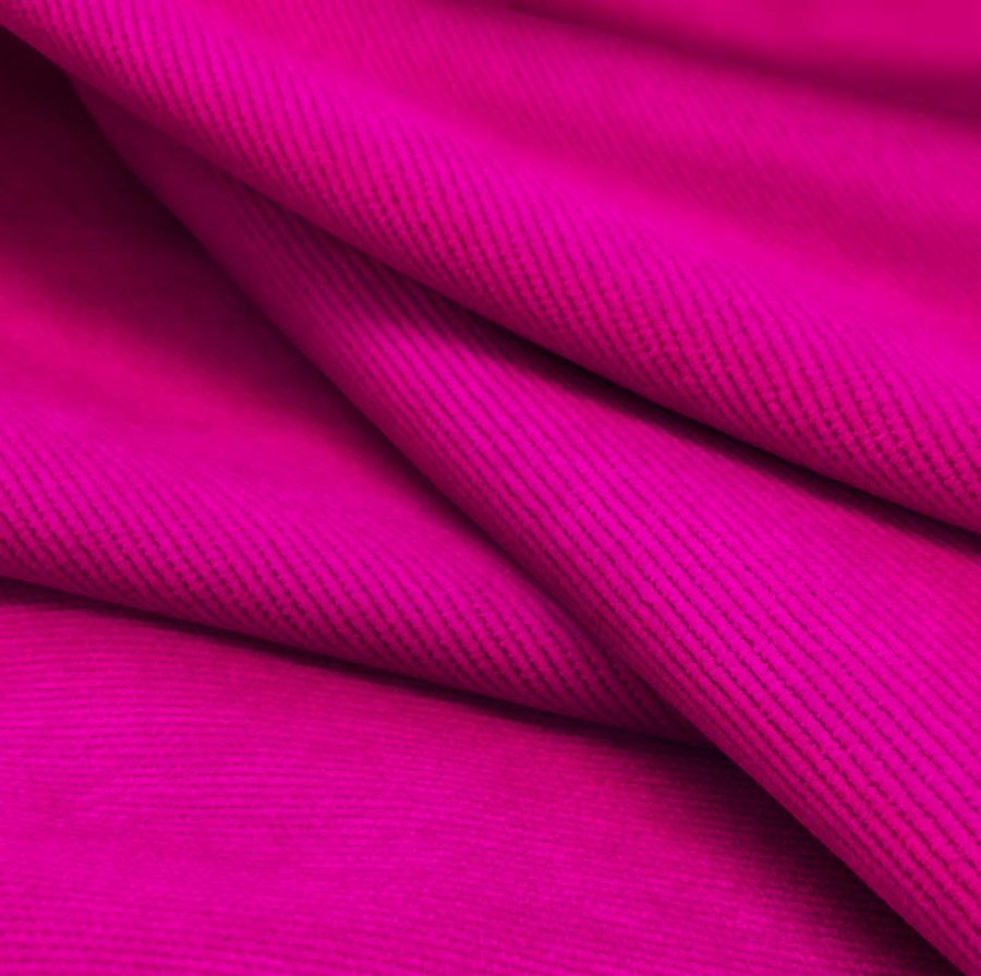 La tela base es la Pana Aterciopelada - Dublin, compuesta por un 85% de poliéster, un 12% de poliamida y un 3% de elastano, con un gramaje de 280 gr/m2 y un ancho de tela de 150 cm. El color liso impreso es un hermoso rosa mexicano, con un contenido CMYK de 2 98 6 0. Este color es una mezcla de magenta intenso y amarillo suave, lo que crea un tono vibrante y cálido. Este color rosa mexicano va bien con otros colores vibrantes como turquesa, verde lima y naranja, pero también funciona bien con tonos más neutros como gris y beige.