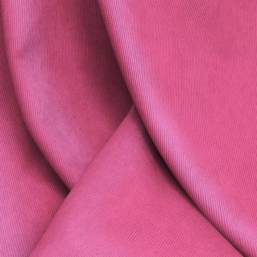 La tela base es de tipo pana aterciopelada de alta calidad, compuesta por 85% poliéster, 12% poliamida y 3% elastano. Su gramaje es de 280 gr/m2 y su ancho de 150 cm. El color liso impreso en esta tela es rosa oscuro, con un contenido de 2 de tinta cian, 79 de tinta magenta, 24 de tinta amarilla y 0 de tinta negra, lo que representa un CMYK de 2 79 24 0.