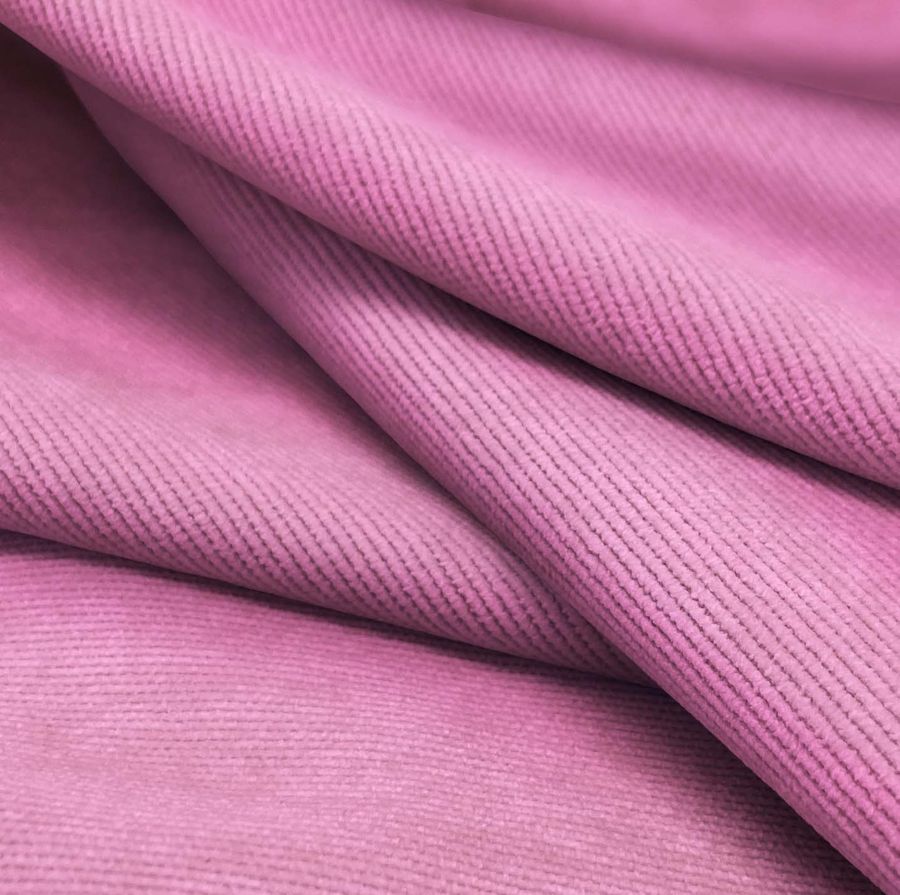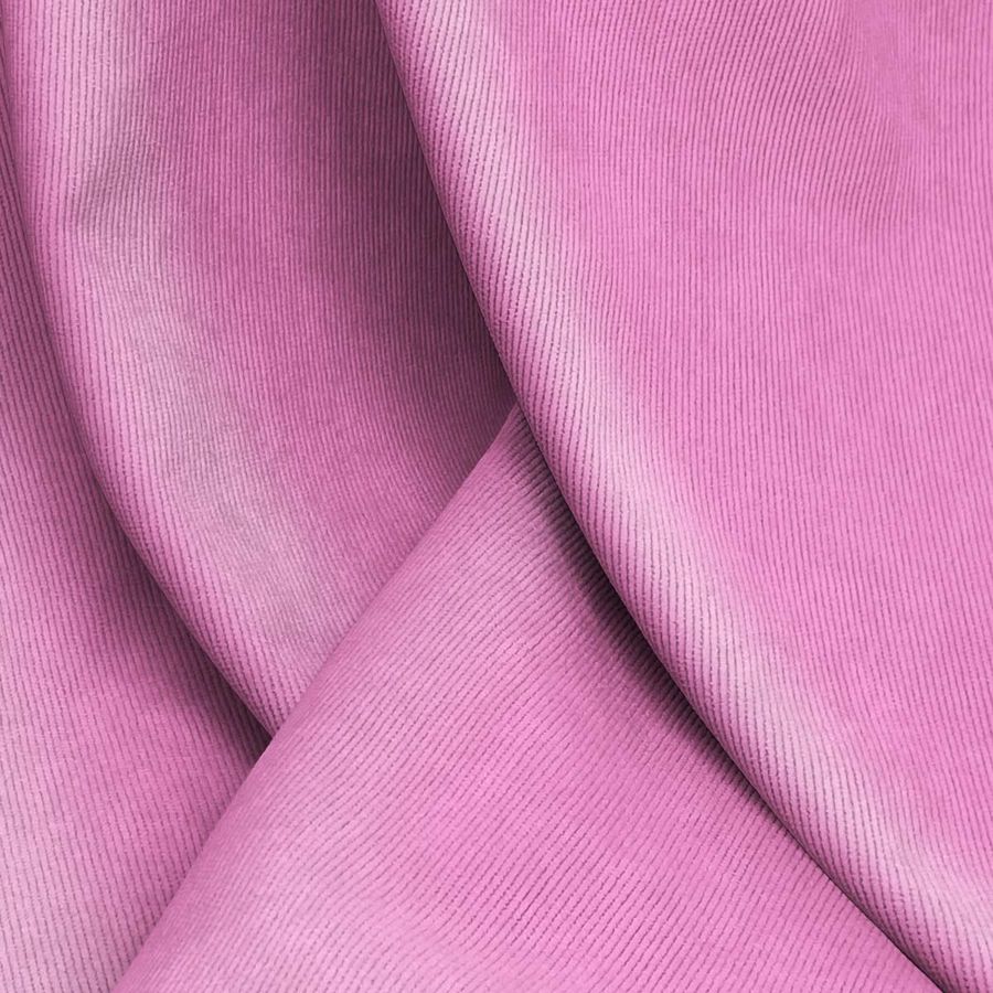 La tela base es la Pana Aterciopelada - Dublin, con un 85% de poliéster, un 12% de poliamida y un 3% de elastano. El color liso impreso es Rosa Persa, con una tinta cyan del 3, una magenta del 62, una yellow del 0 y una black del 0, lo que resulta en un CMYK de 3 62 0 0. La tela posee una textura suave y visual brillante, con un gramaje de 280 gr/m2 y un ancho de 150 cm. El tejido se imprime con el color liso en una sola cara por impresión digital textil.
