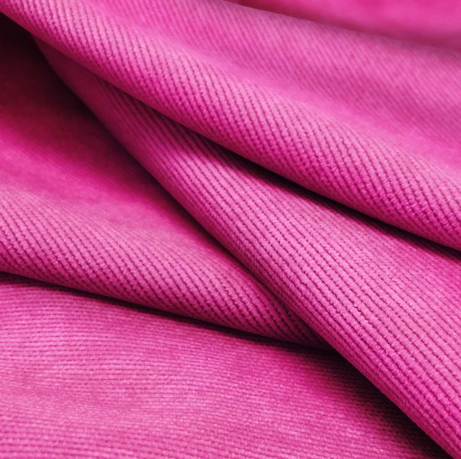 La tela base es una Pana Aterciopelada de tipo Pana, compuesta en un 85% de poliéster, un 12% de poliamida y un 3% de elastano. El color liso impreso en esta tela es Rosé Bonbon, con un CMYK de 0 83 0 0, lo que lo hace vibrante y con un toque de elegancia. Este color se combina bien con tonos neutros como los grises y blancos, así como con tonos de rosa más suaves.