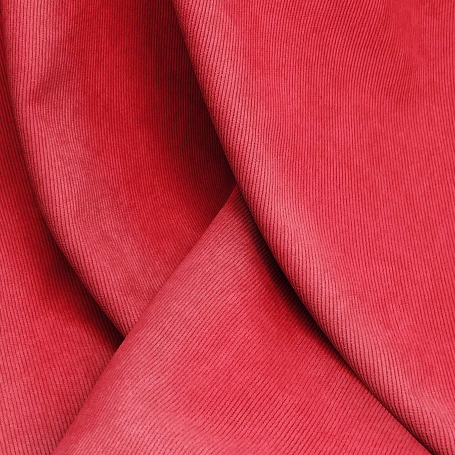 La tela base es la Pana Aterciopelada - Dublin, compuesta por un 85% de poliéster, un 12% de poliamida y un 3% de elastano, con un gramaje de 280 gr/m2 y un ancho de 150 cm. Su color liso impreso es el Rosa Madder, con un CMYK de 2 94 75 0 y un tacto suave y brillante. Este color simboliza pasión, amor y vitalidad, y combina especialmente bien con tonos neutros y dorados.