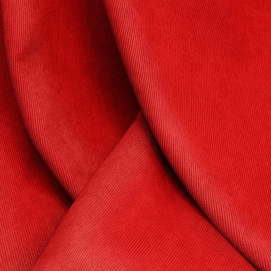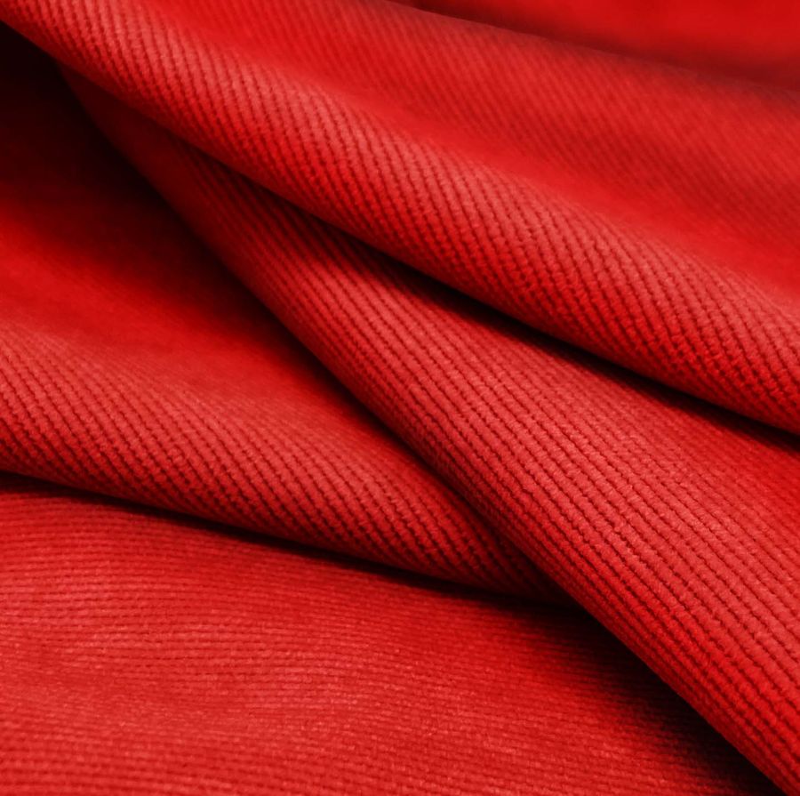 La tela base es la Pana Aterciopelada - Dublin, compuesta por un 85% de poliéster, un 12% de poliamida y un 3% de elastano. Tiene un gramaje de 280 gr/m2 y un ancho de 150 cm. El color liso impreso en esta tela es Rosa Rosso Corsa con un CMYK de 12 100 100 4, que se combina especialmente bien con tonos marrones y nude.