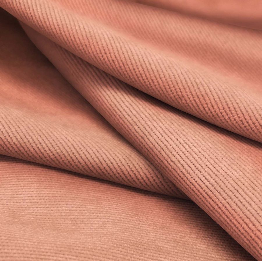 La tela base, Pana Aterciopelada - Dublin, de 280 gr/m2 y compuesta por 85% poliéster, 12% poliamida y 3% elastano, es de tacto suave y visual brillante. El color liso impreso es rosa salmón, con un CMYK de 0 58 50 0, lo que lo hace un tono cálido y suave. Este color combina bien con azules claros, amarillos y verdes. Cabe destacar que la tela está impresa a una sola cara por impresión digital textil, por lo que no es un tejido tintado sino impreso por una sola cara.