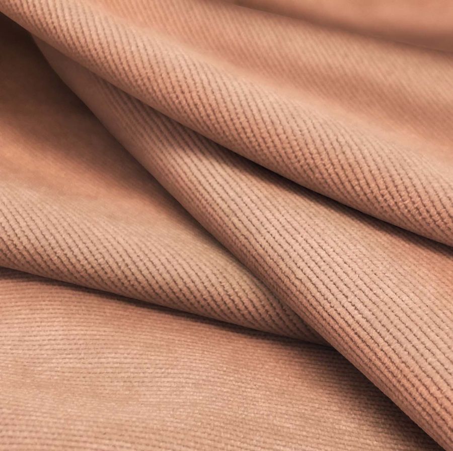 La tela base es Pana Aterciopelada - Dublin, compuesta por 85% de POLIÉSTER, 12% de POLIAMIDA y 3% de ELASTANO. El color liso rosa salmón oscuro se obtiene con una tecnología de impresión por SUBLIMACIÓN (POLIESTER), con una mezcla de 6% de tinta Cyan, 50% de tinta Magenta, 51% de tinta Yellow y 0% de tinta Black (CMYK: 6 50 51 0). Este color secundario, provoca una sensación visual suave y cálida, ideal para la temporada de invierno. Su brillo resalta la textura y el tacto aterciopelado. La combinación de rosa con salmón es perfecta para decorar ambientes suaves y delicados, es fácilmente combinable con tonalidades crudas, blancas y grises.