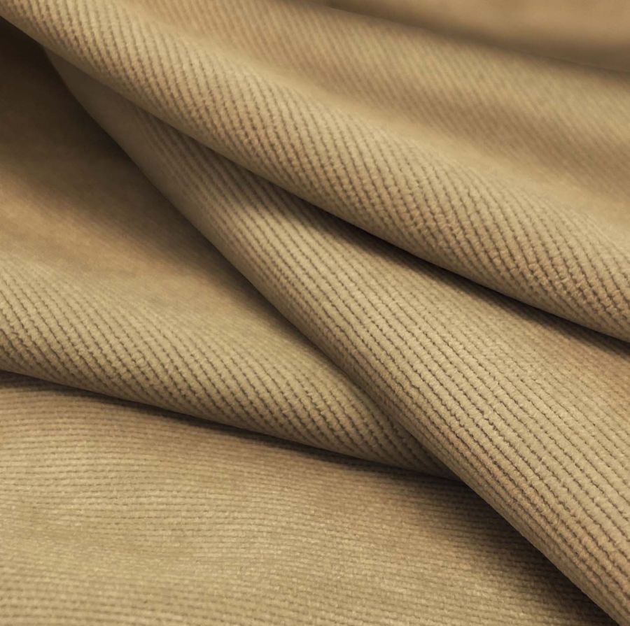 La tela base, Pana Aterciopelada - Dublin, está compuesta por un 85% de poliéster, 12% de poliamida y un 3% de elastano, con un gramaje de 280 gr/m2 y un ancho de 150 cm. En cuanto al color, el marrón y el camello están presentes en el color liso impreso, con un contenido de tinta CYMK de 26 39 60 15. Este color secundario se caracteriza por ser cálido, elegante y atemporal, combinando con otros tonos tierra y neutros.