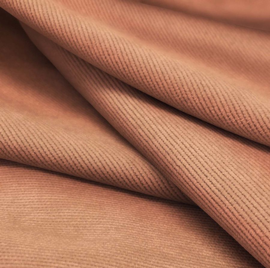 La tela base es la Pana Aterciopelada - Dublin, compuesta por un 85% de poliéster, un 12% de poliamida y un 3% de elastano, con un gramaje de 280 gr/m2 y un ancho de 150 cm. El color liso impreso tiene un contenido CMYK de 16 59 60 4, lo que resulta en un marrón carnelian intenso y cálido. Este color simboliza la pasión, la energía, la fuerza y la determinación. Es un color que se puede combinar muy bien con tonos tierra y neutros, así como con dorado y mostaza.