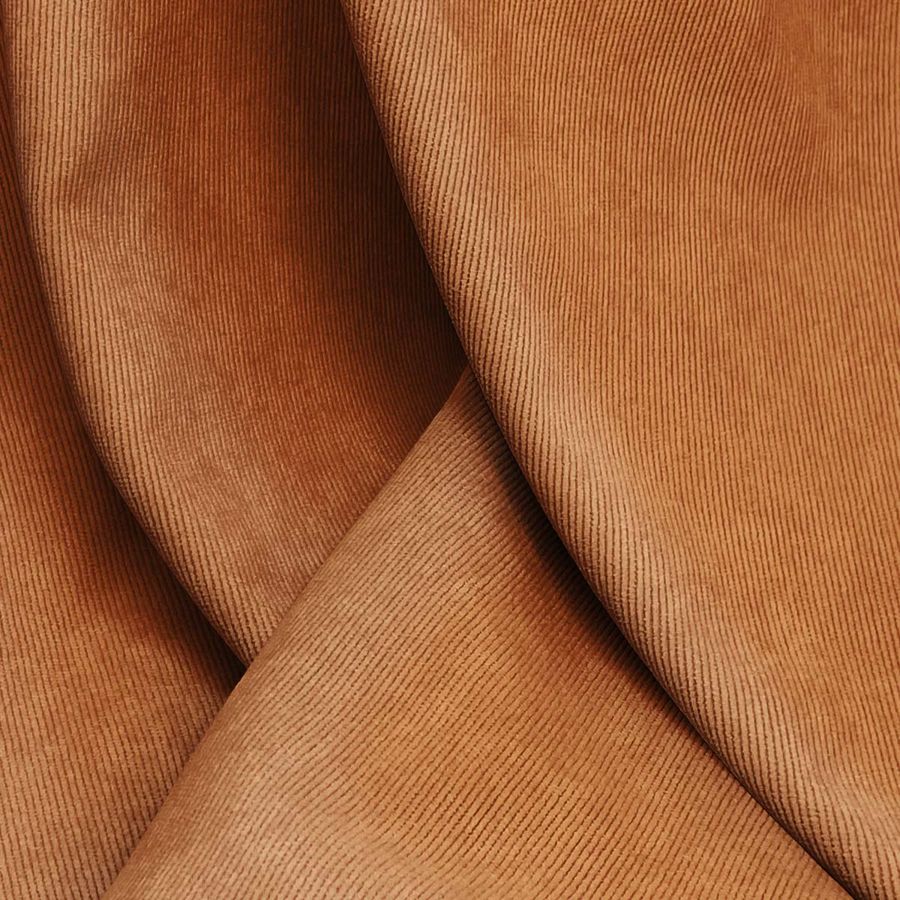 La tela base es Pana Aterciopelada - Dublin, compuesta por 85% POLIÉSTER, 12% POLIAMIDA y 3% ELASTANO, con un gramaje de 280 gr/m2 y un ancho de 150 cm. El color impreso es marrón y anaranjado, con un CMYK de 27 68 89 21. El color secundario es un cálido y terroso marrón, que proyecta una sensación de naturalidad y estabilidad. Combina muy bien con colores tierra, beige, verde oscuro y negro. La tela está impresa con el color liso a una sola cara por impresión digital textil, siendo esta una técnica de alta calidad que garantiza la fidelidad del color y la nitidez en la definición de los detalles.