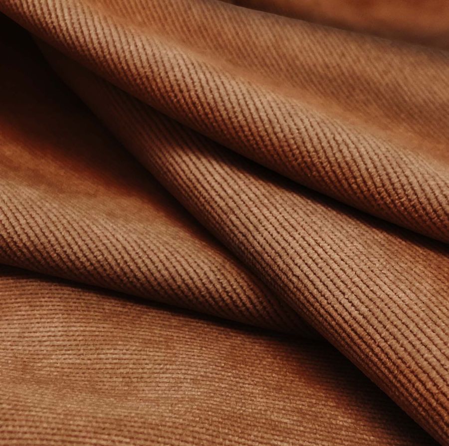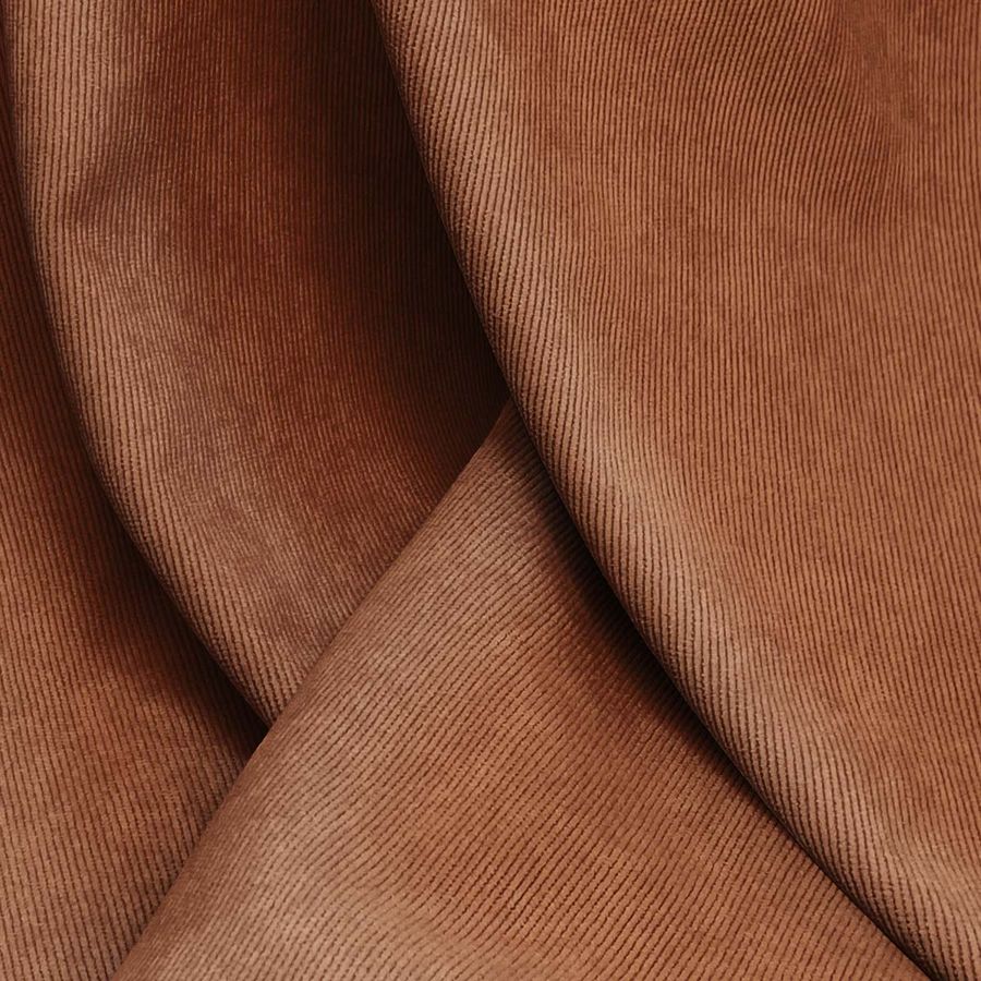 La tela base de esta descripción es la Pana Aterciopelada - Dublin, compuesta principalmente de poliéster, poliamida y elastano. Su gramaje es de 280 gr/m2 y su ancho alcanza los 150 cm. El color liso impreso en esta tela es el Marrón Momia, cuyo CMYK está compuesto por 34 de cian, 71 de magenta, 83 de amarillo y 42 de negro. Este color nos transmite una sensación orgánica y cálida, y combina muy bien con tonos tierra y dorados.