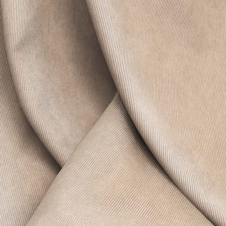 La tela base es la Pana Aterciopelada – Dublin, compuesta por 85% poliéster, 12% poliamida y 3% elastano, con un gramaje de 280 gr/m2 y un ancho de 150 cm. El color liso impreso es marrón con un CMYK de 16-30-38-4, lo que le da una sensación cálida y natural al tacto. El color combina perfectamente con tonos crema, beige y negros. La tela está impresa con el color liso a una sola cara por impresión digital textil, lo que permite una definición del color y diseño de alta calidad en el tejido.