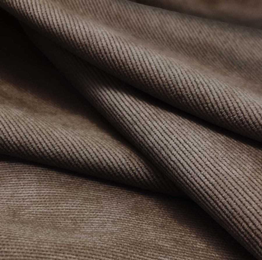 La tela base es la Pana Aterciopelada - Dublin, con una composición de 85% POLIÉSTER, 12% POLIAMIDA y 3% ELASTANO, un gramaje de 280 gr/m2 y un ancho de 150 cm. El color liso impreso en este tejido es Marron Pimienta, que se compone de tinta Cyan: 53, magenta: 57, yellow: 56 y black: 59 con un CMYK de 53 57 56 59. Este color evoca la sensación de calidez, confort y estabilidad. Simbólicamente, el marrón es el color de la naturaleza, de la tierra, representa la solidez y la estabilidad, mientras que el toque sutil de pimienta le da un nuevo nivel a este tono dando la sensación de sofisticación. Se combina muy bien con tonos ocres y dorados, así como con tonos azulados.