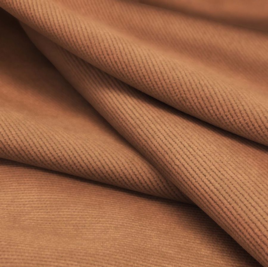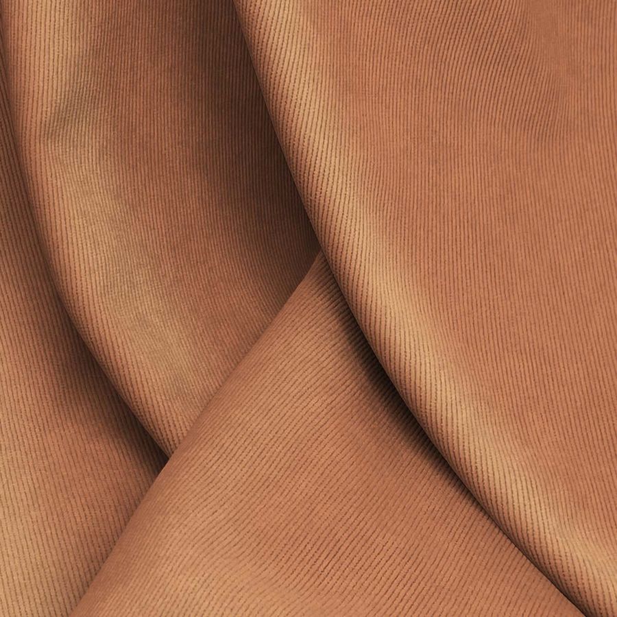 La tela base es la Pana Aterciopelada - Dublin, compuesta por 85% POLIÉSTER, 12% POLIAMIDA y 3% ELASTANO de 280 gr/m2 y una anchura de 150 cm. El color liso impreso es de un Marrón Terracota Oscuro, con un contenido CMYK de 25 61 69 17. Este color secundario simboliza la buena disposición para el equilibrio, la estabilidad y la independencia. Técnicamente, este color representa el equilibrio cálido de los tonos rojos y naranjas, con un fondo frío en el tono verdoso-grisáceo. El Marrón Terracota Oscuro combina bien con colores neutros como beige, crema y blanco roto, así como con tonos dorados o amarillos mostaza y tonos rojizos oscuros. La tela se imprime a una sola cara por impresión digital textil, no tintada.