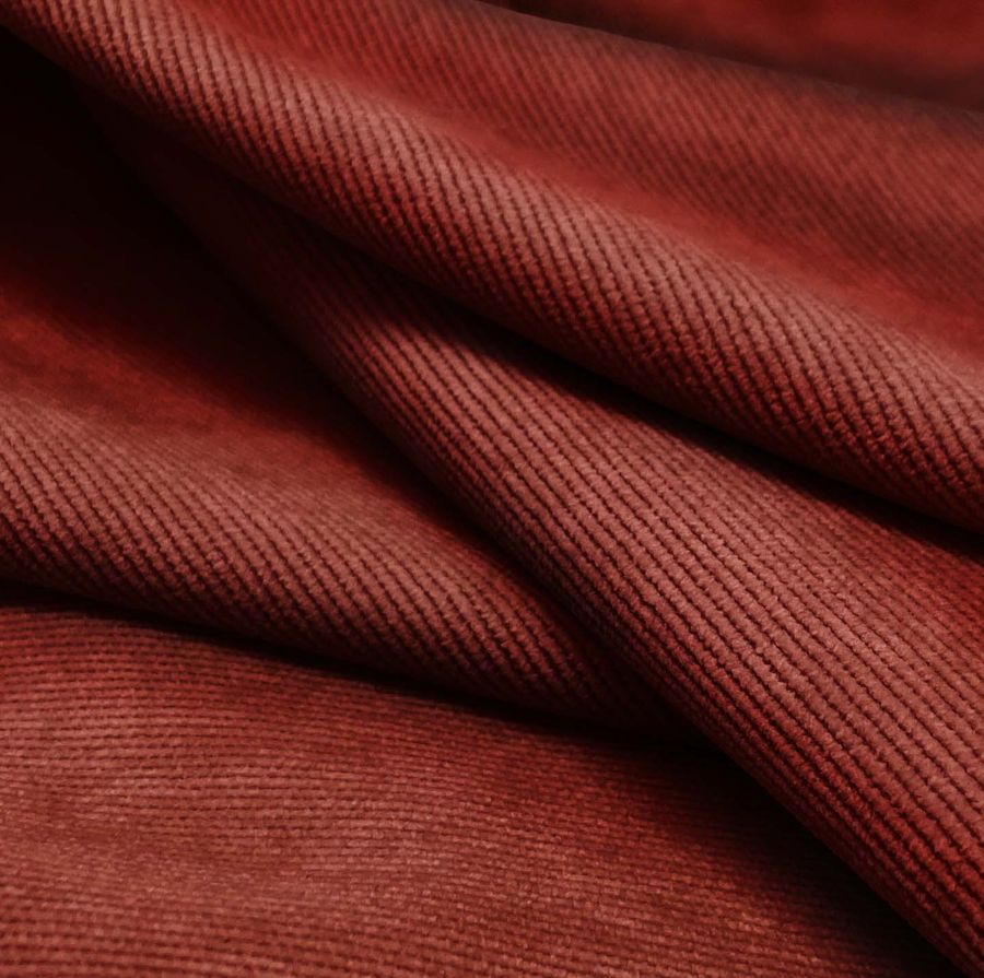 La tela base es la pana aterciopelada - Dublin con una composición de 85% poliéster, 12% poliamida y 3% elastano, y un gramaje de 280 gr/m2. El color liso impreso es marrón zorro rojo con un CMYK de 35 100 92 55, lo que destaca por su alta concentración de magenta y amarillo. Este color secundario simboliza la pasión y la vitalidad, pero también la calidez y la comodidad. Combina especialmente bien con tonos neutros y oscuros, como el gris, el negro, el marrón y el beige. El tejido está impreso con el color liso a una sola cara por impresión digital textil, y no es un tejido tintado sino impreso por una sola cara.