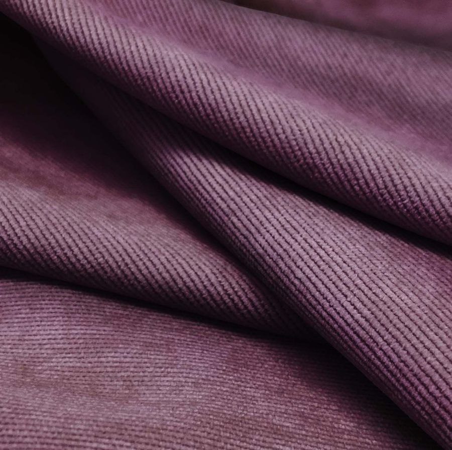 La tela base de este tejido es la Pana Aterciopelada Dublin, compuesta por poliéster, poliamida y elastano, con un gramaje de 280 gr/m2 y un ancho de 150 cm. El color liso impreso es un Morado Bizancio Oscuro, con un CMYK de 62 78 38 36 y un aspecto visual brillante. Este color secundario es un tono intenso, profundo y elegante, que combina a la perfección con otros tonos oscuros como el negro y el gris, así como con algunas tonalidades de azul o verde.