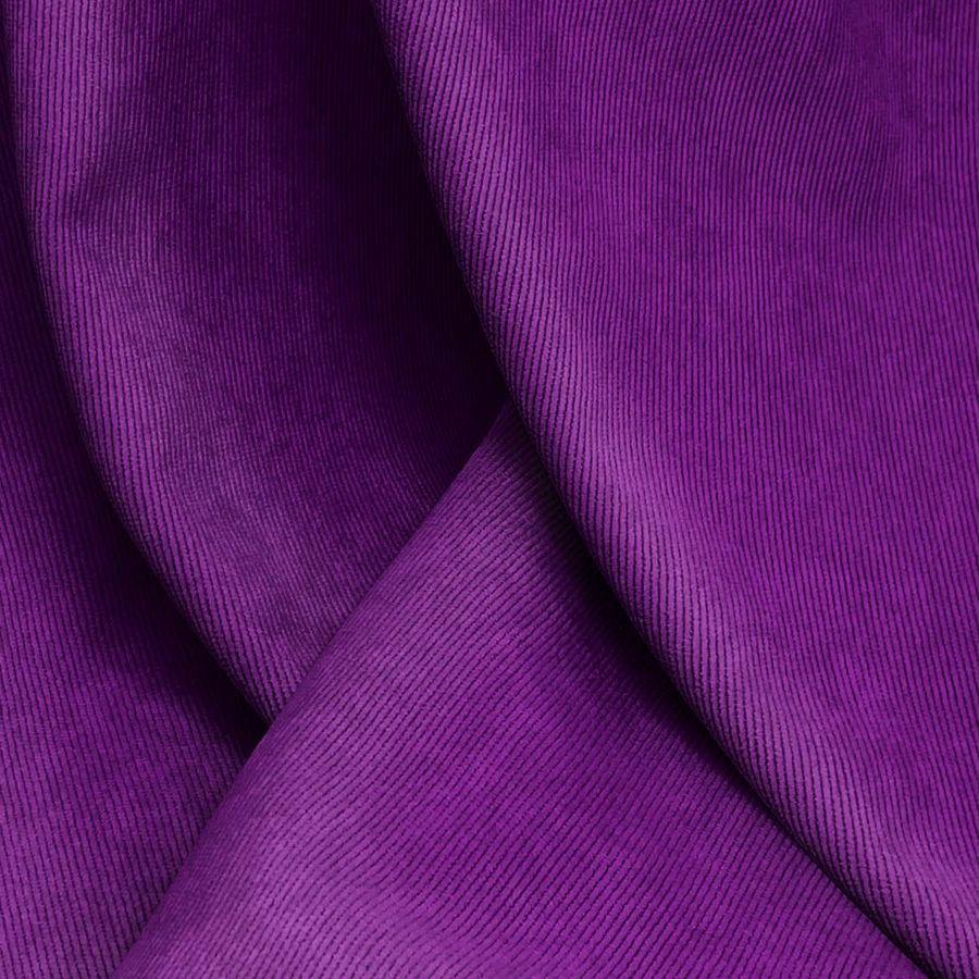 La tela base es Pana Aterciopelada - Dublin, compuesta por 85% POLIÉSTER, 12% POLIAMIDA, 3% ELASTANO, con un gramaje de 280 gr/m2 y un ancho de 150 cm. El color liso impreso es Morado-Mora, con una composición de tinta Cyan: 82, Magenta: 100, Yellow: 29 y Black: 24, lo que resulta en un CMYK de 82 100 29 24. Este color secundario, que combina el morado intenso con el toque oscuro del mora, simboliza el lujo y la elegancia con la transgresión y el misterio. La tela está impresa con el color liso a una sola cara por impresión digital textil, lo que significa que no es un tejido tintado sino impreso por una sola cara.