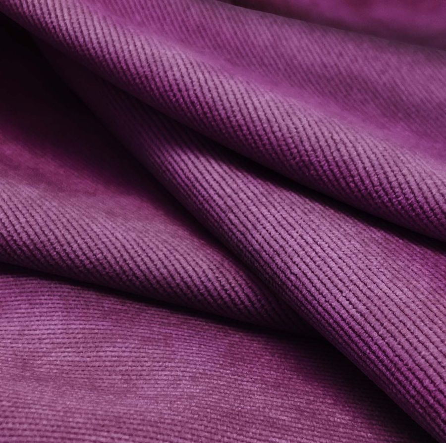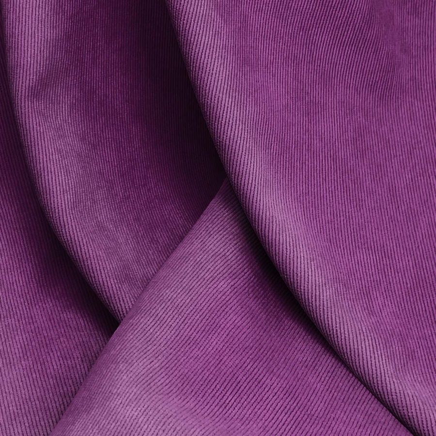La tela base es la Pana Aterciopelada - Dublin, compuesta por un 85% de poliéster, un 12% de poliamida y un 3% de elastano, con un gramaje de 280 gr/m2 y un ancho de 150 cm. El color liso impreso es Morado Palatinado Púrpura, con un CMYK de 65 95 27 20. Este color se caracteriza por su profundidad y su riqueza, combinando maravillosamente con colores neutros y tonos tierra. La tela está impresa con el color liso a una sola cara por impresión digital textil.