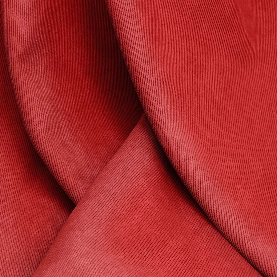 La tela base es la Pana Aterciopelada - Dublin, compuesta mayoritariamente por poliéster y poliamida con un toque de elastano, lo que le otorga una textura suave al tacto y un gramaje de 280 gr/m2. El color liso impreso es un rojo intenso llamado “Deseo” que se caracteriza por tener un bajo componente de tinta negra y una elevada saturación de los colores cian, magenta y amarillo. Combinando esta tonalidad con blancos fríos y negros, se logran contrastes llamativos y elegantes.